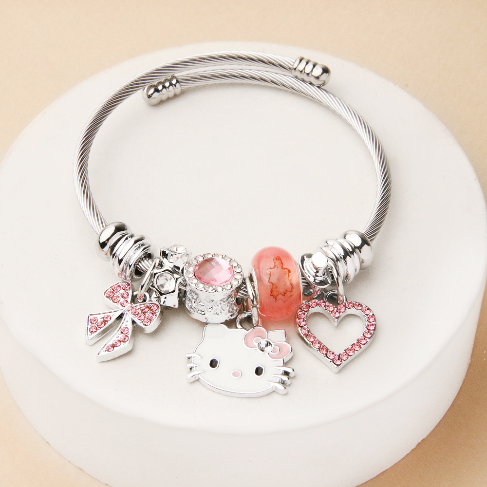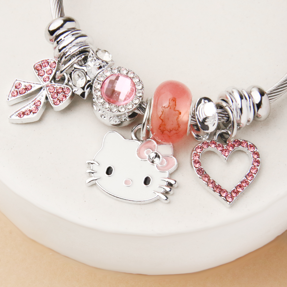 دستبند پاندورا کیتی و پاپیون یکی از مدلهای فانتزی و بسیار دوستداشتنی خانه اکسسوری کیان است که با آویز کیتی در کنار پاپیون ظریف، حس شادی، لطافت و استایل کودکانهـدخترانه را به دستان شما میبخشد. ترکیب رنگهای ملایم صورتی با جزئیات نقرهایرنگ براق، جلوهای شیرین و چشمنواز به این دستبند داده است.