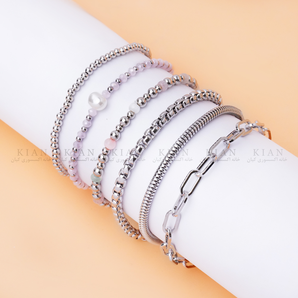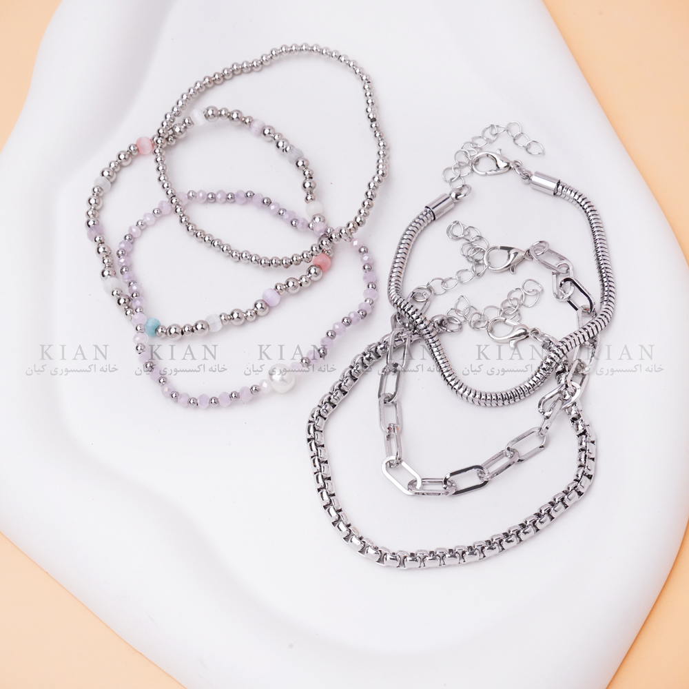 پک دستبند نقرهای از کالکشن لوکس و ظریف خانه اکسسوری کیان، با طراحی هماهنگ و درخشان خود، جلوهای شیک و همیشهبهروز به استایل شما میدهد. این مجموعه شامل چند دستبند ظریف با زنجیرهای براق، مهرههای نقرهای و آویزهای کوچک است که هم بهصورت تکی و هم ترکیبی جلوهای فوقالعاده دارند.