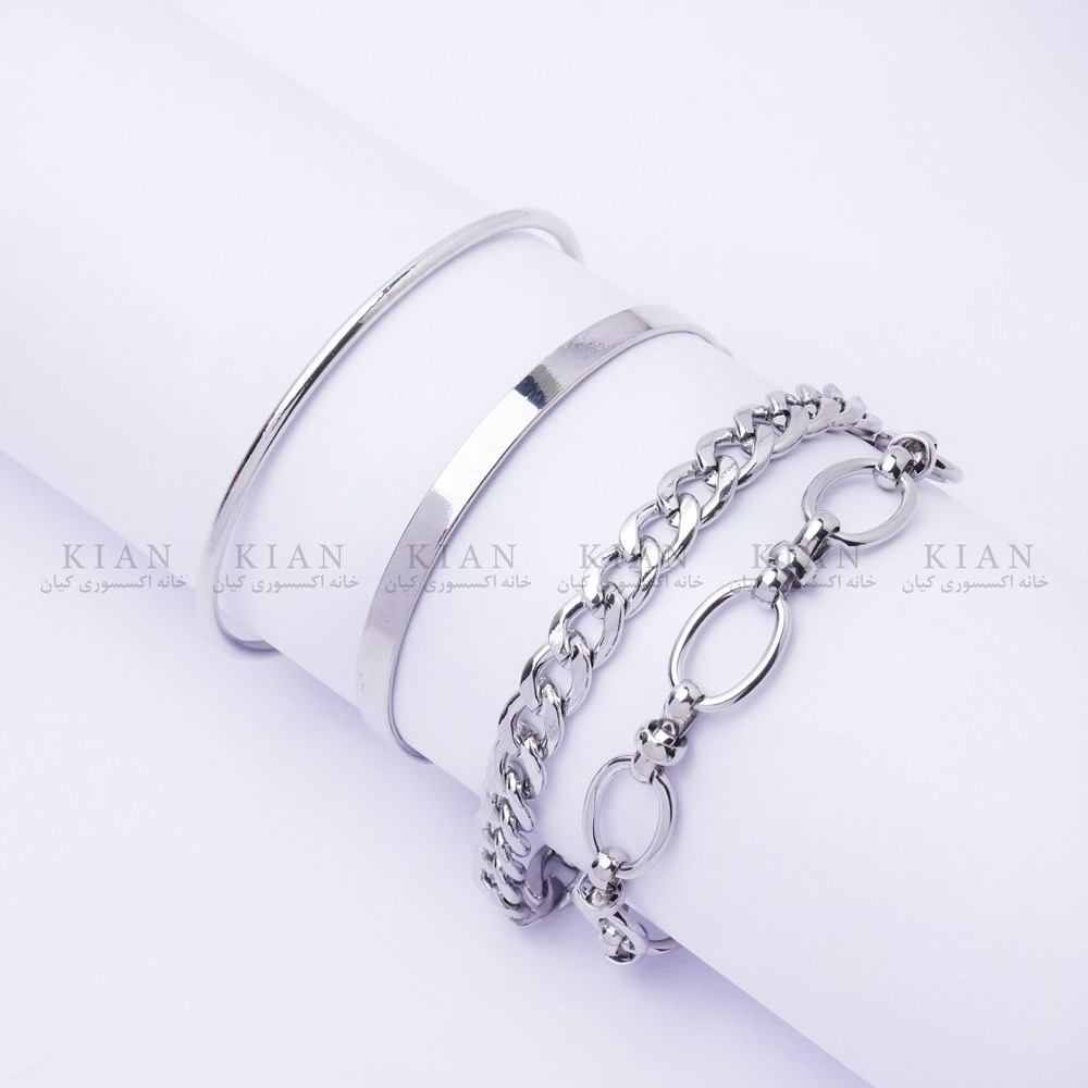 پک دستبند نقره‌ای توپی از مجموعه زیورآلات خاص خانه اکسسوری کیان، ترکیبی از طراحی مدرن و درخشش کلاسیک است. این ست شامل چند دستبند النگویی و زنجیری نقره‌ای با جزئیات توپی شکل ظریف است که در کنار هم جلوه‌ای مینیمال، شیک و زنانه ایجاد می‌کنند.