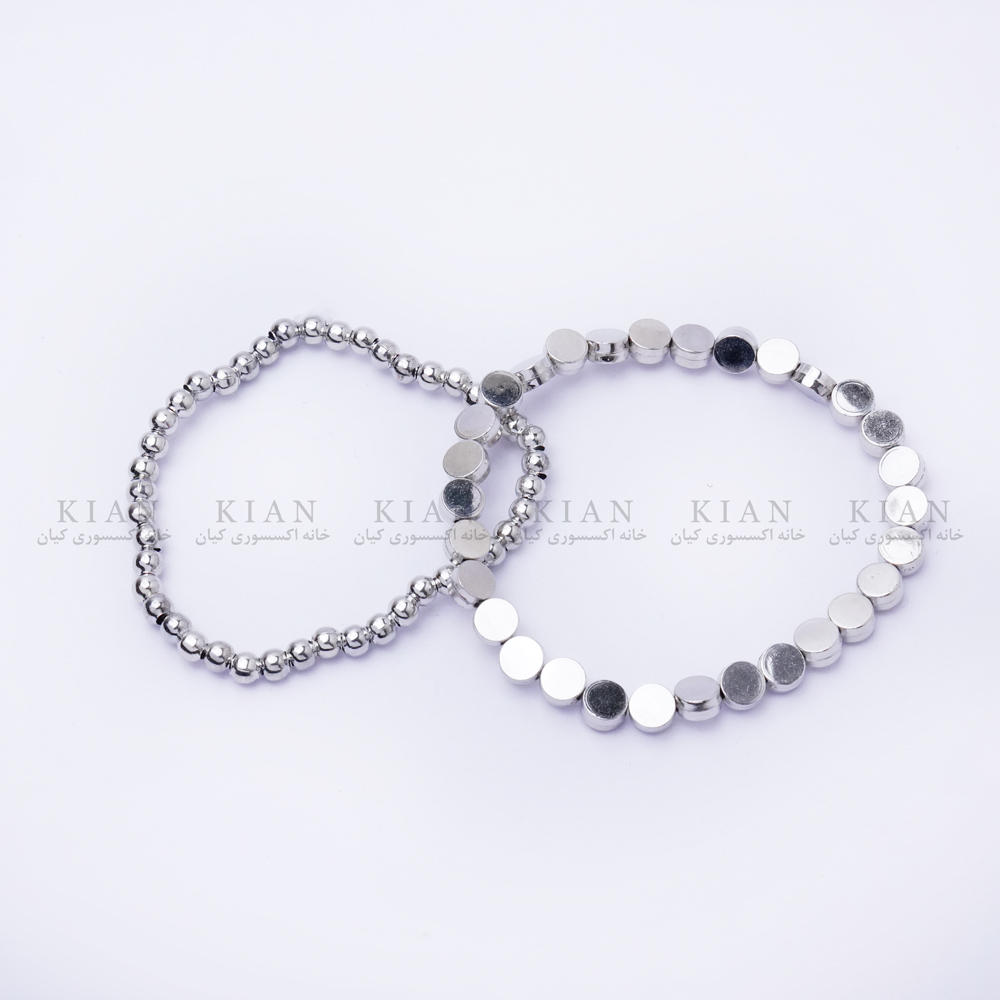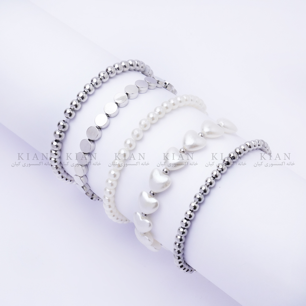 درخشش رنگ نقرهای در کنار سفیدی براق مرواریدها، این پک را به گزینهای ایدهآل برای استایلهای روزمره و مجلسی تبدیل کرده است. طراحی کشی و سبک آن نیز باعث میشود برای هر اندازه مچ دست مناسب و استفاده از آن بسیار راحت باشد.