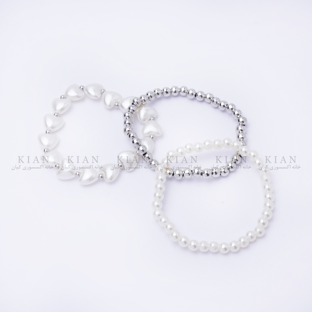 پک دستبند نقرهای مروارید قلبی از مجموعه زیورآلات خاص خانه اکسسوری کیان، ترکیبی لطیف از عشق و درخشش است. این ست شامل چند دستبند ظریف نقرهای با جزئیات مرواریدی و آویزهای قلبی شکل است که در کنار هم جلوهای عاشقانه، شیک و زنانه ایجاد میکنند.
