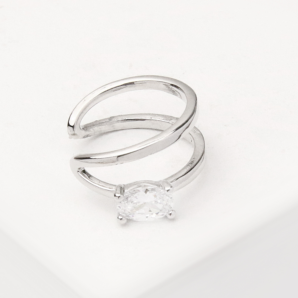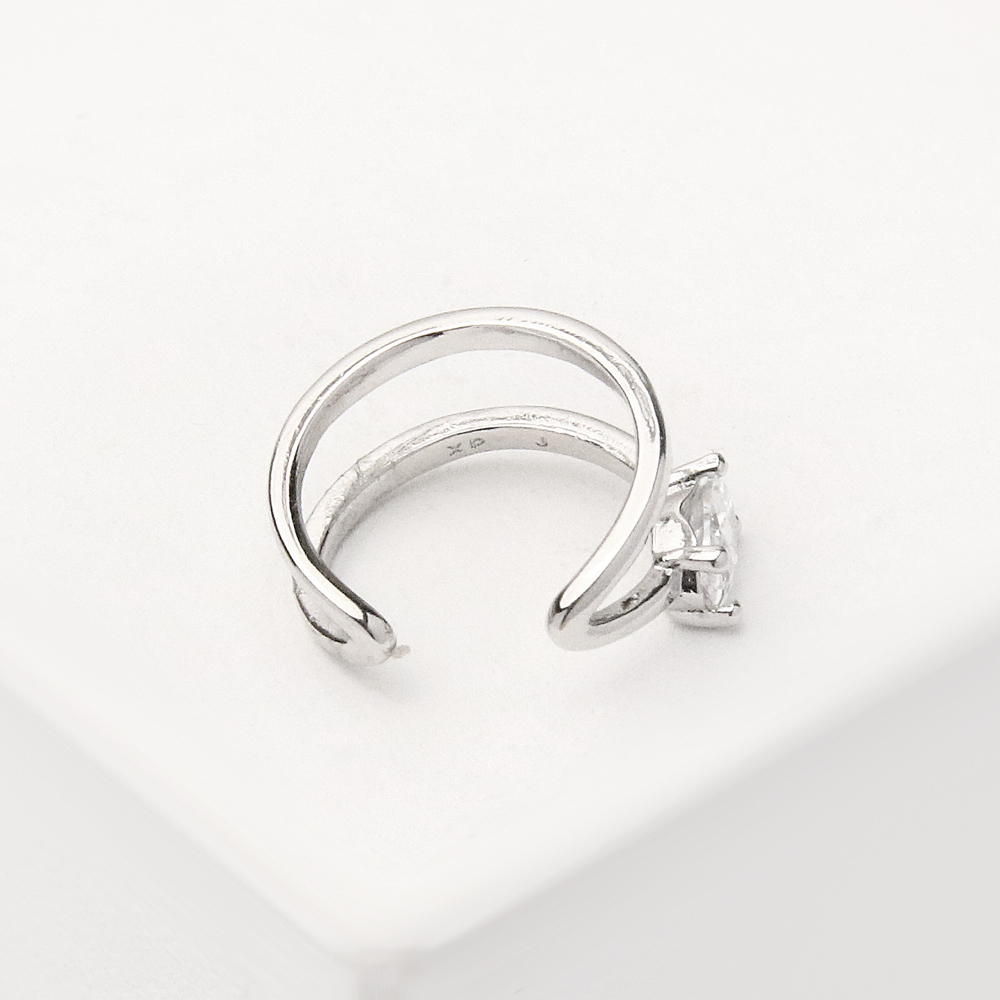 این ایرکاف با طراحی باز و فرم موجی ساخته شده و در بالاترین بخش خود، یک تکنگین براق قرار دارد که با کوچکترین حرکت، جلوهای درخشان و چشمگیر ایجاد میکند. بدنه نقرهای براق آن، حالتی بسیار تمیز و امروزی دارد و همین باعث میشود با هر مدل گوشواره یا استایل روزانه بهخوبی ست شود.