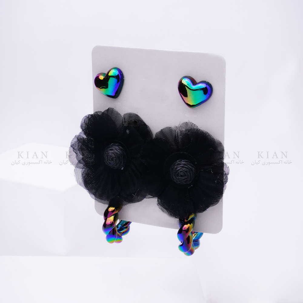 پک گوشواره توری مشکی از برند خانه اکسسوری کیان، انتخابی جسورانه و خاص برای بانوانی است که به استایل‌های مدرن و متمایز علاقه دارند. ترکیب قلب‌های براق چندرنگ در قسمت بالایی و گل‌های توری مشکی ظریف با آویزهای درخشان، جلوه‌ای چشم‌گیر و مرموز به این گوشواره‌ها بخشیده است.