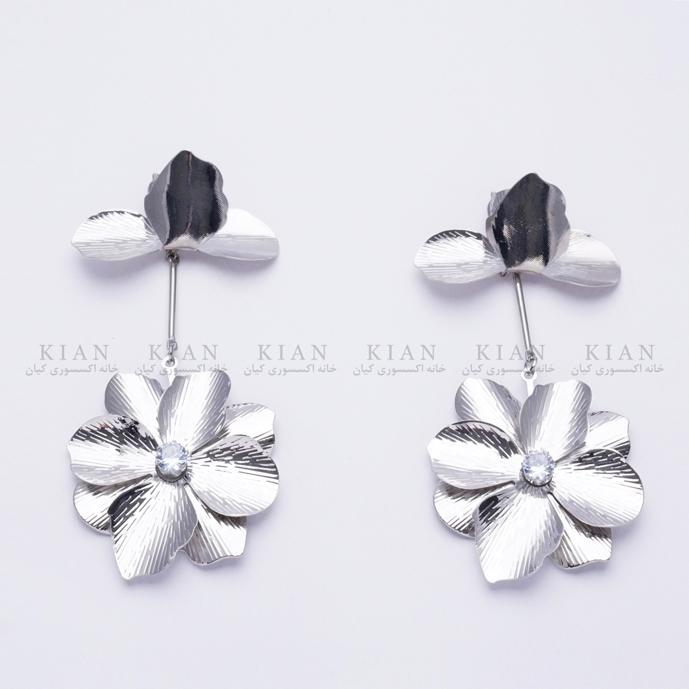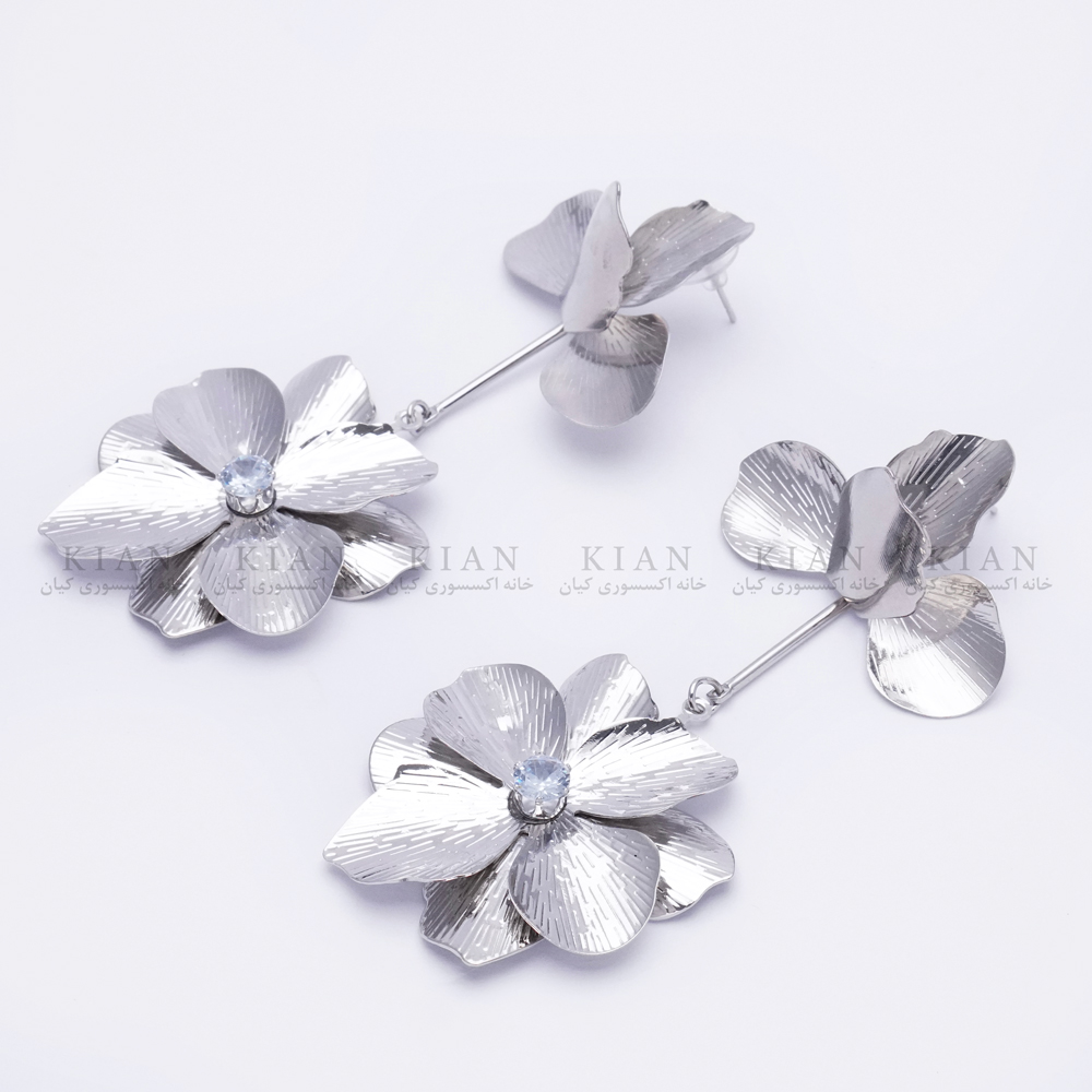 این گوشواره‌های آویز زیبا به شکل گل طراحی شده‌اند، با گلبرگ‌های براق و بافت‌دار که جلوه‌ای لوکس و چشم‌نواز دارند. یک سنگ درخشان در مرکز هر گل قرار گرفته که به جذابیت بیشتر طراحی اضافه می‌کند. این مدل برای مناسبت‌های رسمی و استایل‌های خاص کاملاً مناسب است.
