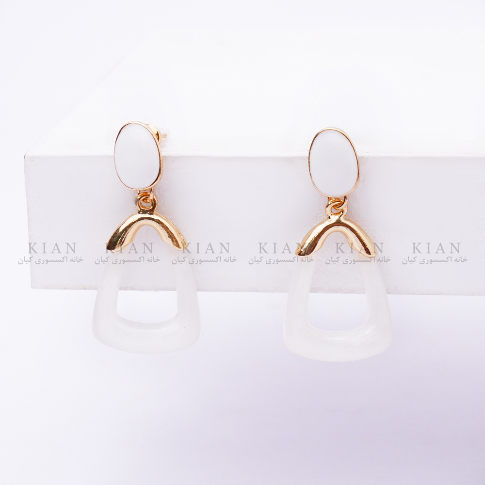در قسمت بالایی یک دایره صدفی سفید قرار دارد که با قاب طلایی باریک احاطه شده و ظاهری مینیمال و شیک ارائه میدهد. بخش آویزی گوشواره نیز یک فرم هندسی صدفی شفاف است که با اتصال طلایی ظریف به بخش بالایی وصل شده و با حرکت بسیار نرم خود، جلوهای لطیف و زنانه ایجاد میکند.