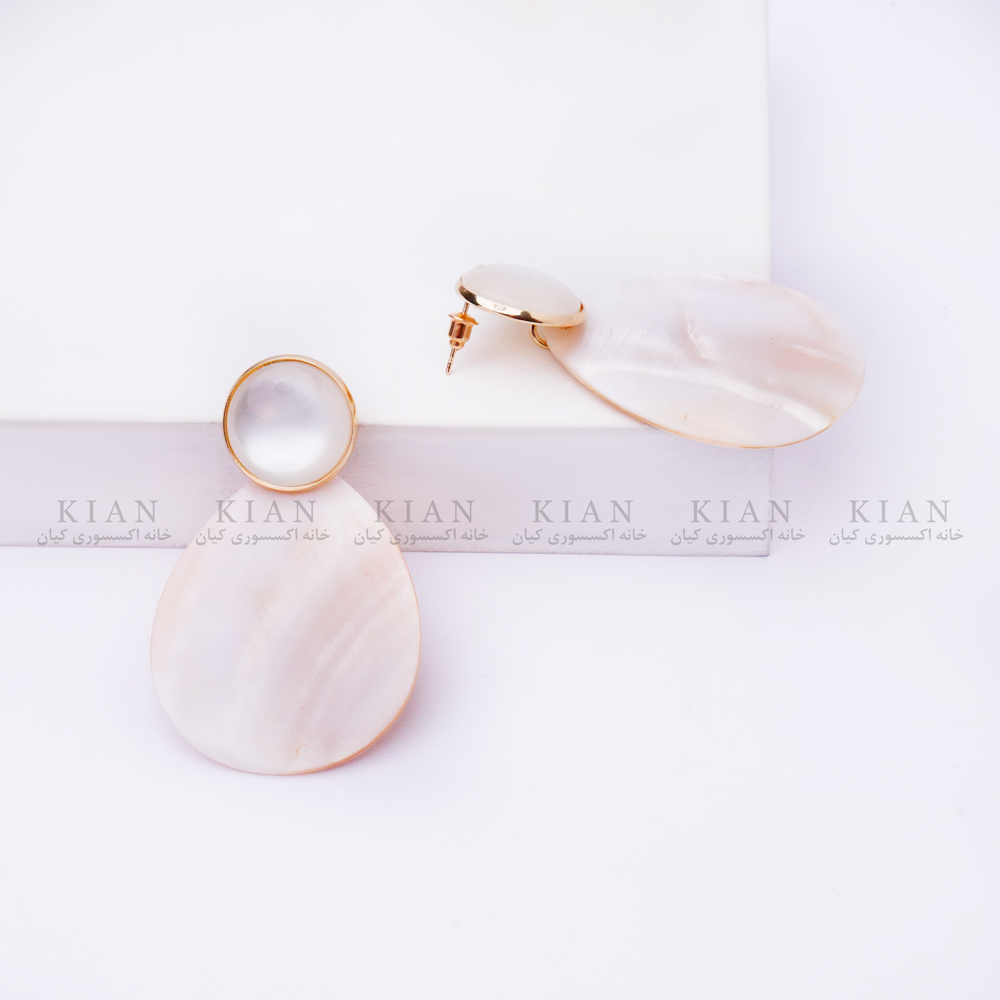 در قسمت بالایی، یک دایره صدفی براق قرار دارد که با قاب طلایی ظریف احاطه شده است. در بخش پایینی نیز یک قطره اشکی بزرگ و موجدار دیده میشود که با بافت ابری و ترکیب رنگهای صورتی–گلبهی، ظاهری بسیار لطیف و هنری دارد. همین ترکیب باعث میشود گوشواره بهصورت طبیعی بدرخشد و استایلی خاص و منحصربهفرد ایجاد کند.