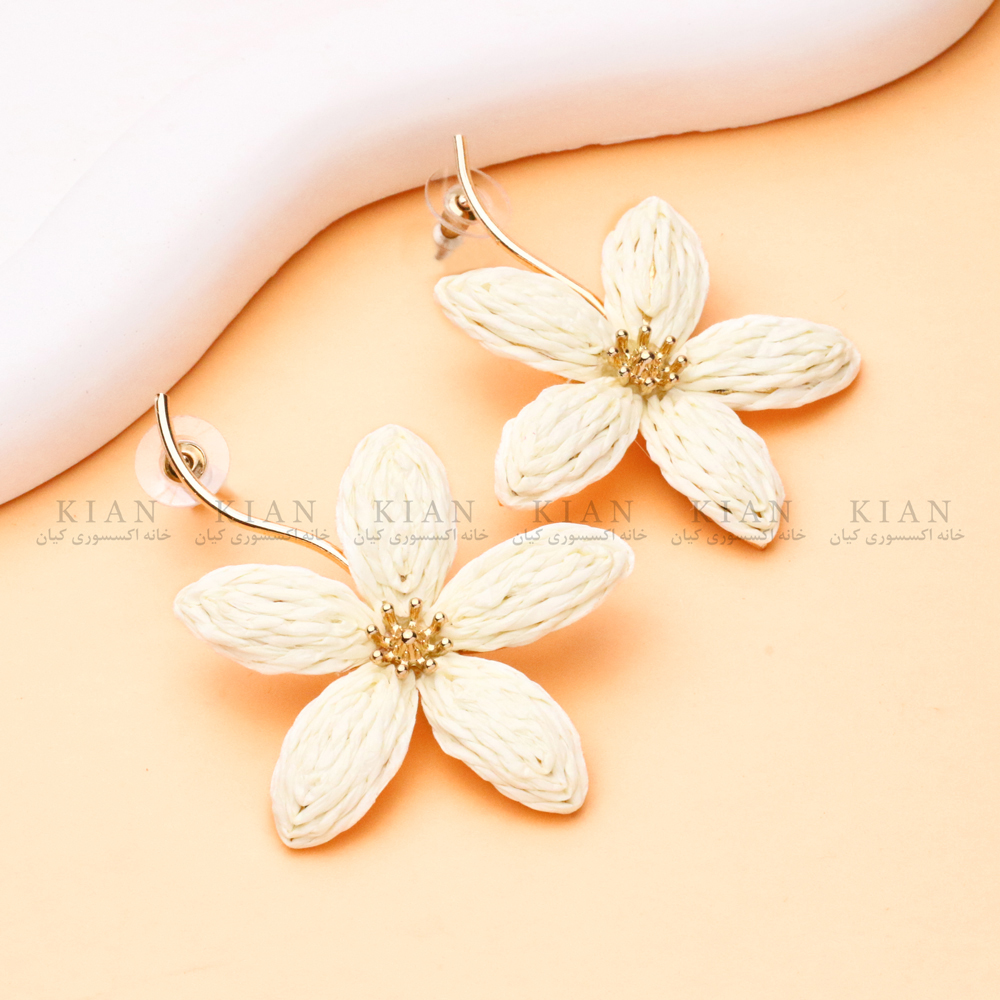 این گوشواره از الیاف حصیری سبک ساخته شده که در قالب گل پنج‌پر طراحی شده و جلوه‌ای طبیعی، هنری و بسیار دلنشین دارد. مرکز گل با یک هسته طلایی براق تزئین شده که ترکیب حصیر و فلز را کاملاً چشمگیر و هماهنگ کرده است. آویز بودن این گوشواره باعث می‌شود حرکت زیبایی داشته باشد و روی صورت جلوه‌ای دخترانه و بسیار جذاب ایجاد کند.