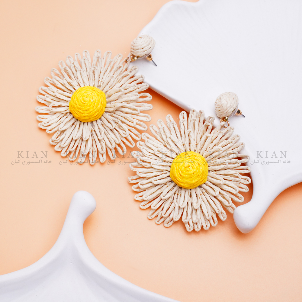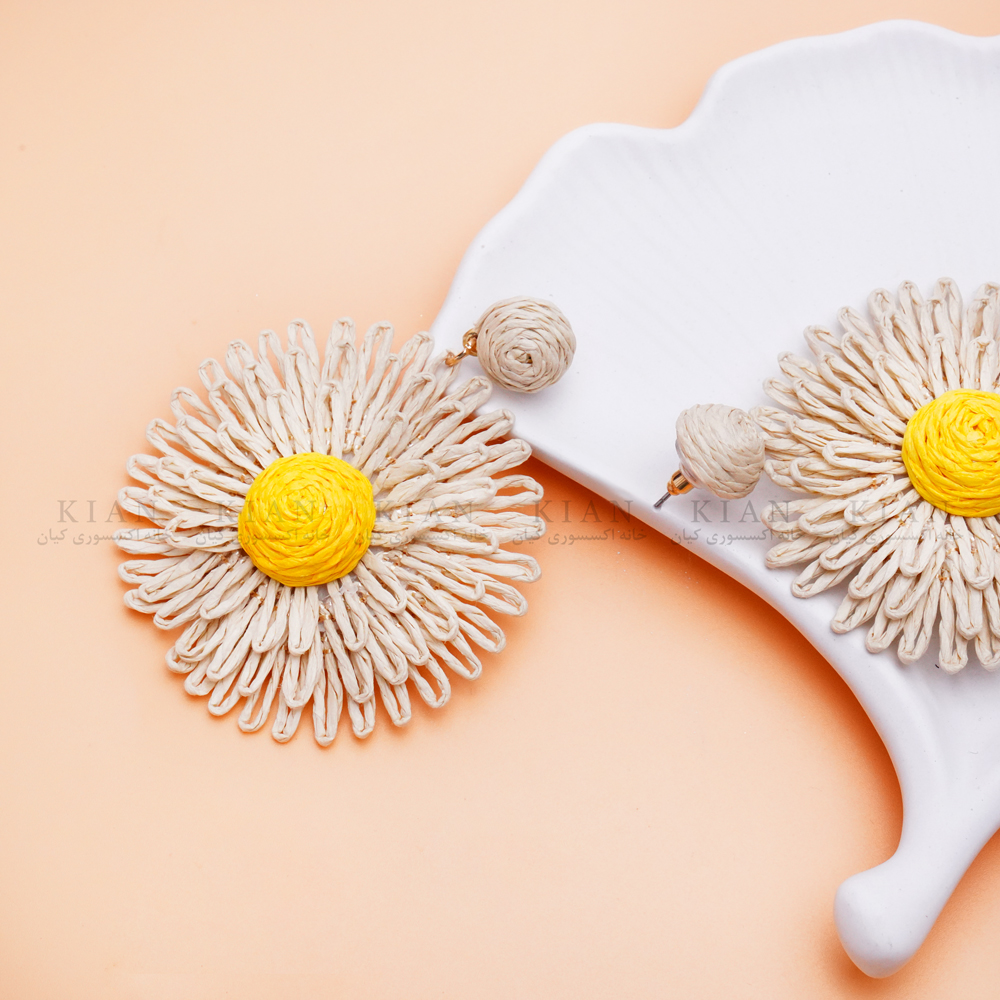 گوشواره حصیری گل زرد با طراحی دست ساز و رنگ های شاد گل ها، جلوه ای جذاب و فانتزی به استایل شما می بخشد. گل های کوچک با رنگ های زرد و کرم روی بافت حصیری ظریف، حس سرزندگی و انرژی مثبت را منتقل می کنند.