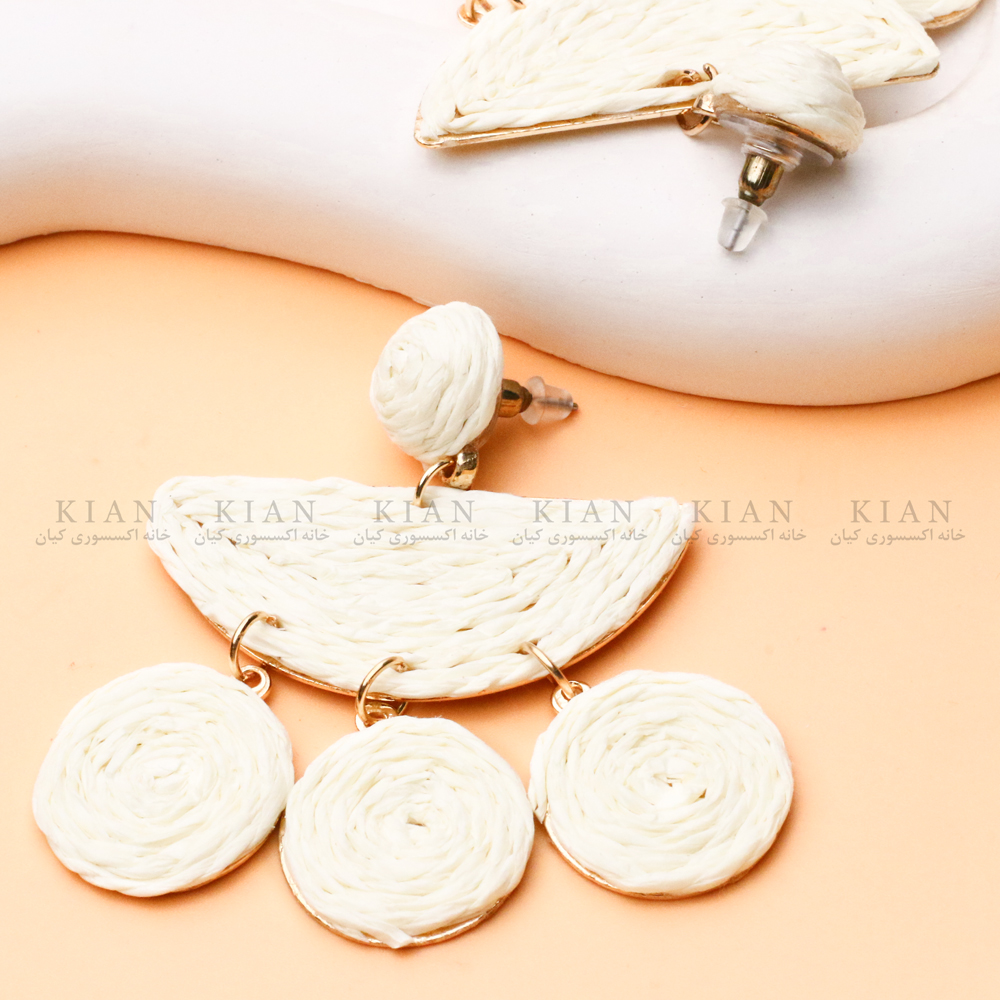 بخش بالایی این گوشواره از یک نیمدایره حصیری با بافت منظم ساخته شده و در بخش پایین آن چند دایره حصیری کوچک بهصورت آویزی قرار گرفتهاند که با حرکت سر، جلوهای بسیار زیبا و دخترانه ایجاد میکنند. این ترکیب هندسی باعث میشود گوشواره روی صورت بسیار متعادل، لطیف و جذاب دیده شود.