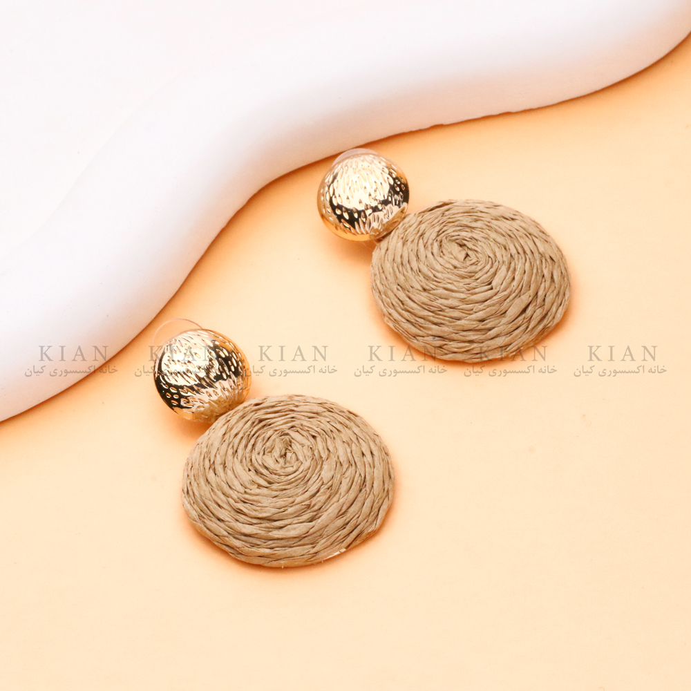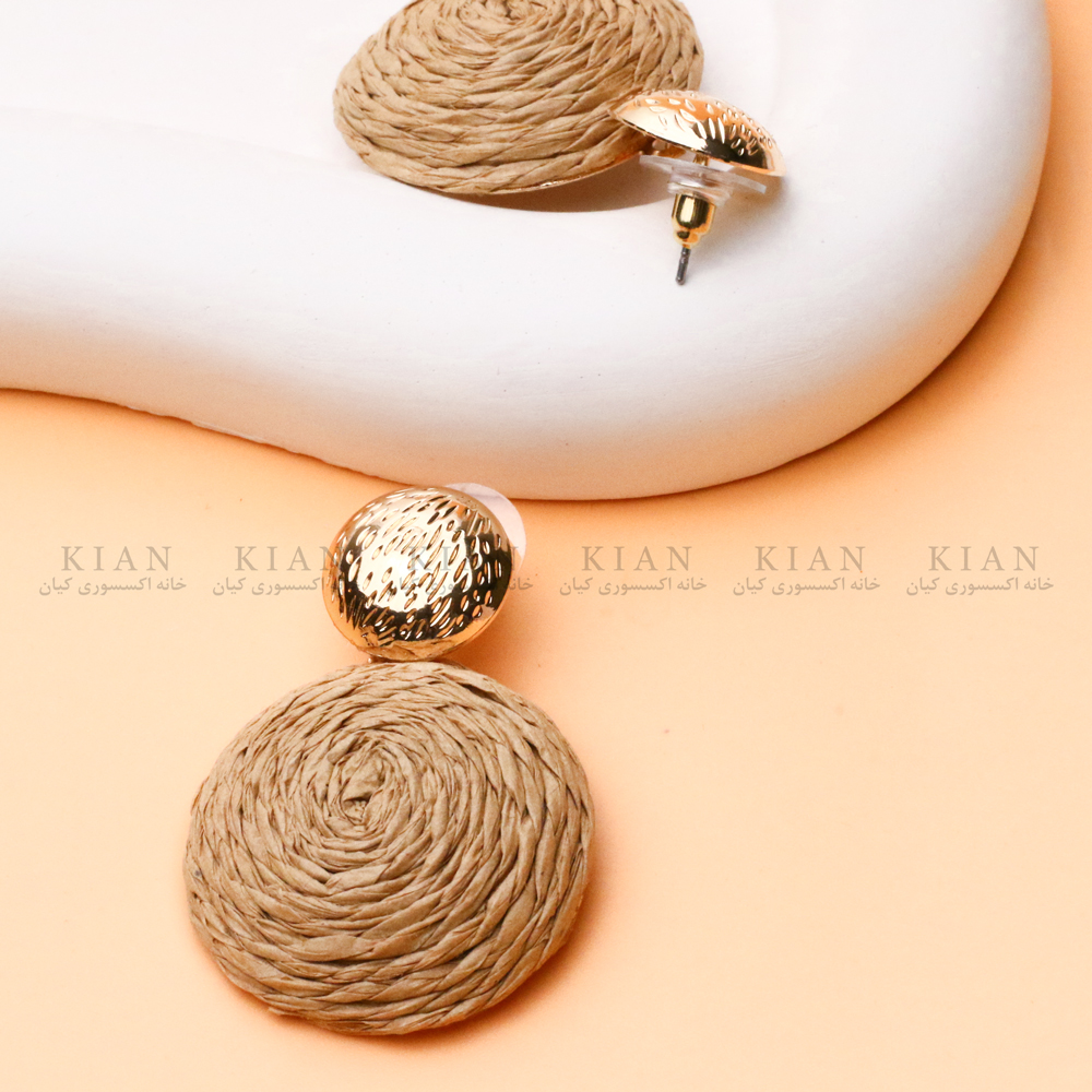 بخش آویزی این گوشواره از الیاف حصیری به شکل دایره‌ای تخت با بافت منظم ساخته شده که ظاهری شبیه یک کلاه کوچک حصیری را تداعی می‌کند. رنگ تیره و جذاب این بافت، حس گرما و طبیعت را منتقل کرده و جلوه‌ای چشمگیر و تابستانی به استایل می‌بخشد. بخش بالایی گوشواره نیز یک دکمه طلایی براق است که تضاد زیبایی با رنگ حصیر ایجاد کرده و ظاهر اکسسوری را لوکس‌تر می‌کند.