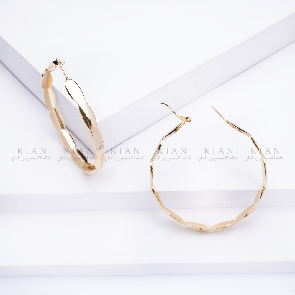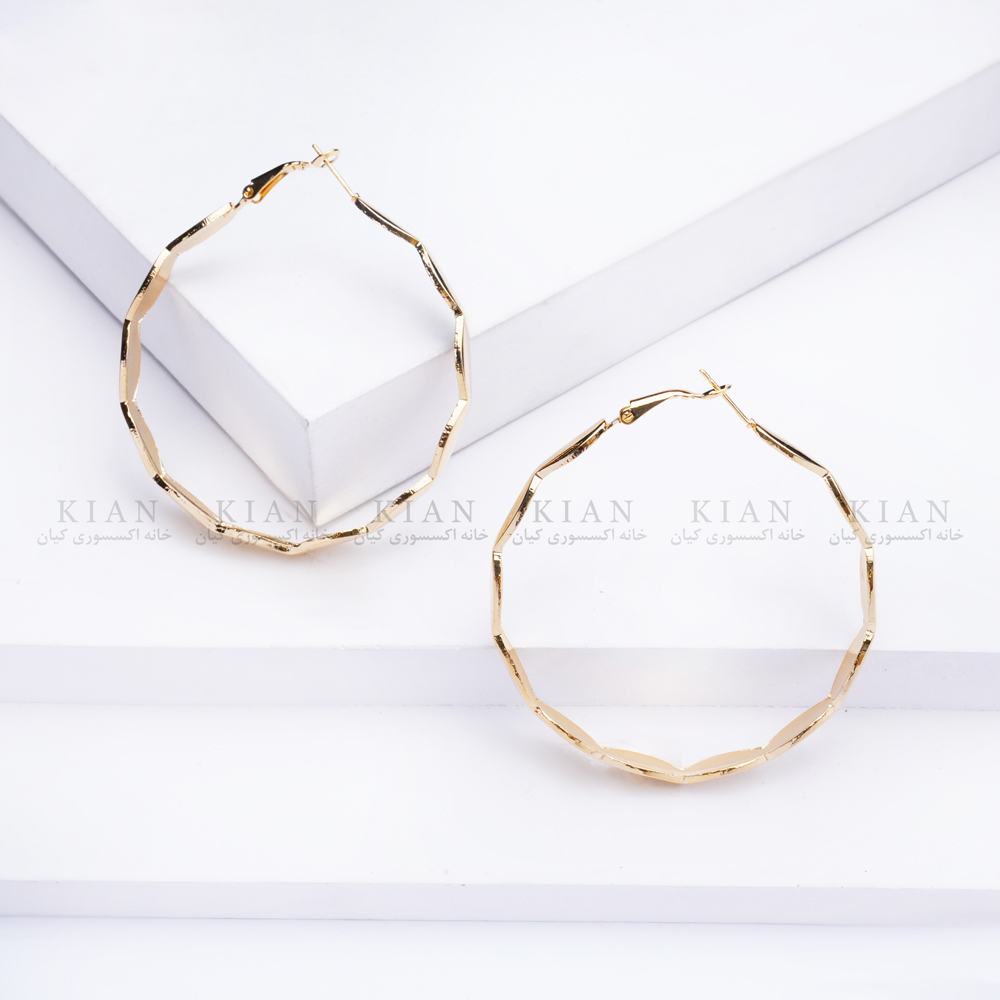 گوشواره حلقه‌ای طلایی برش‌دار از کالکشن ظریف و درخشان خانه اکسسوری کیان، ترکیبی از سادگی و ظرافت در طراحی است. سطح طلایی براق با خطوط و برش‌های ظریف، جلوه‌ای خاص و چشم‌نواز ایجاد می‌کند و در نور برق زیبایی به خود می‌گیرد.