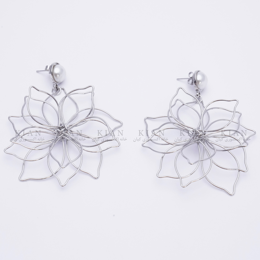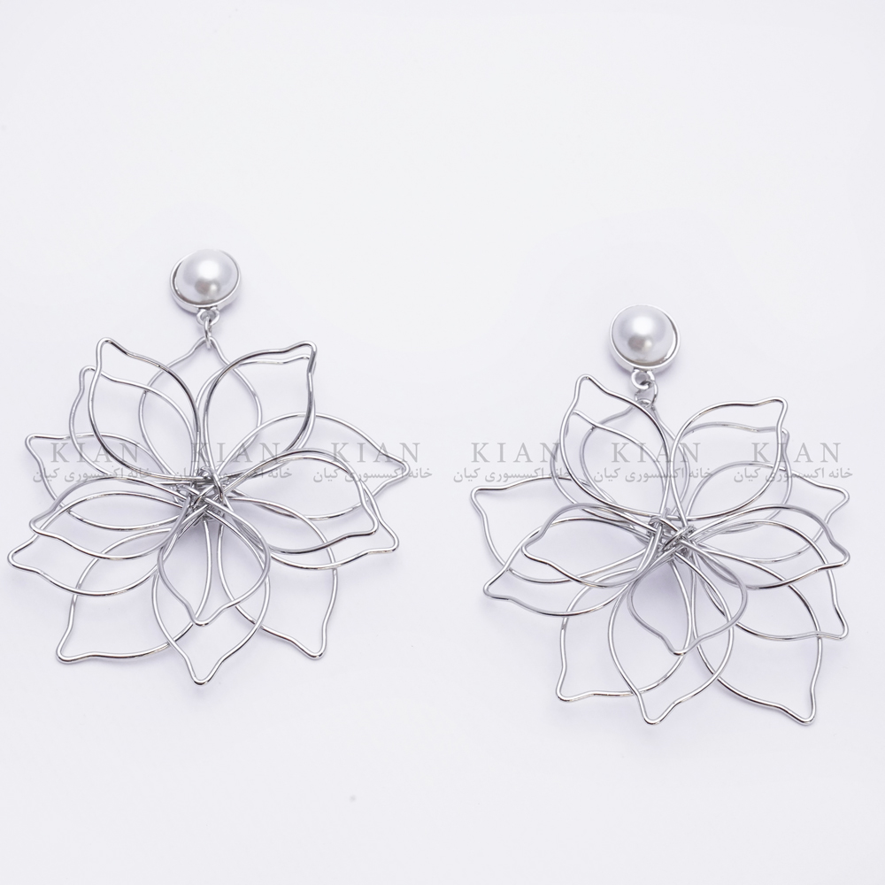 این گوشواره‌ها طراحی منحصر‌به‌فردی دارند که به شکل گل طراحی شده است. فریم فلزی نقره‌ای با لبه‌های ظریف و باز ایجاد شده و در مرکز آن‌ها یک دانه با سطح براق قرار دارد که جلوه‌ای مدرن و شیک به آن‌ها می‌بخشد. طراحی ارگانیک این گوشواره‌ها حسی از طبیعت و زیبایی ساده را منتقل میکند