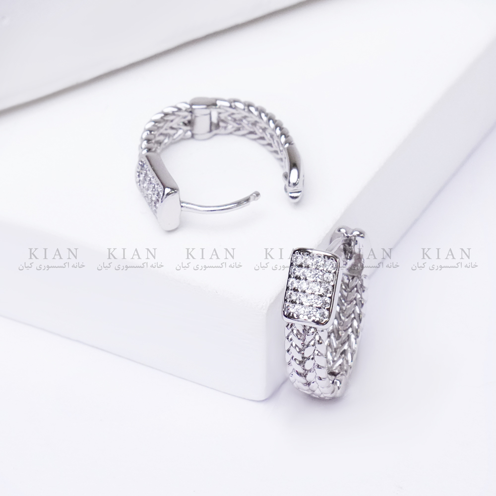 گوشواره ژوپینگ بافت و نگین نقرهای یکی از شیکترین و لوکسترین مدلهای حلقهای نقرهای در مجموعه زیورآلات خانه اکسسوری کیان است؛ مدلی که ترکیب بافت برجسته و ردیف نگینهای درخشان را در کنار هم دارد و جلوهای بسیار چشمگیر و متفاوت روی گوش ایجاد میکند.