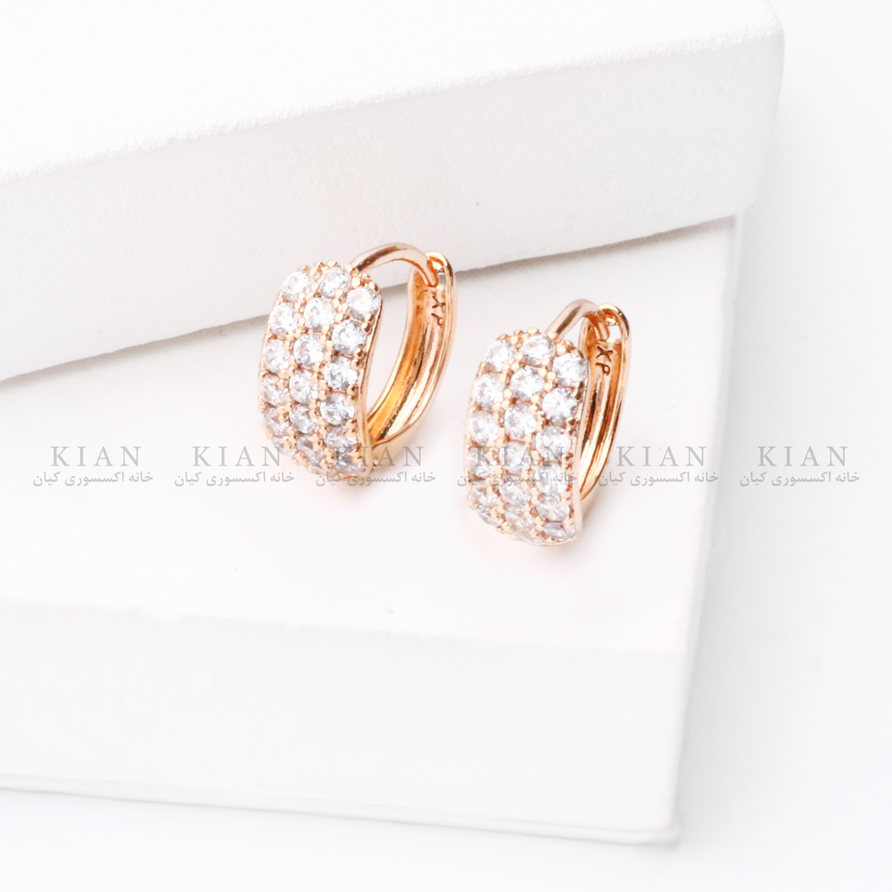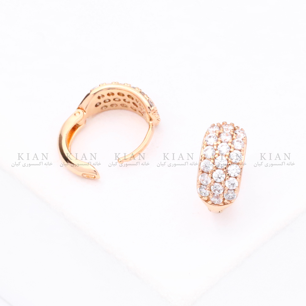 این گوشوارهها به شکل هلالی ظریف طراحی شدهاند و سطح آنها کاملاً با نگینهای سفید ریز و براق پوشیده شده است. این نگینها هنگام برخورد با نور، برق خیرهکنندهای ایجاد میکنند و باعث میشوند گوشواره روی گوش بسیار دیده شود. قاب طلایی شیک دور نگینها نیز جلوه مدل را لوکستر و مرتبتر میکند.