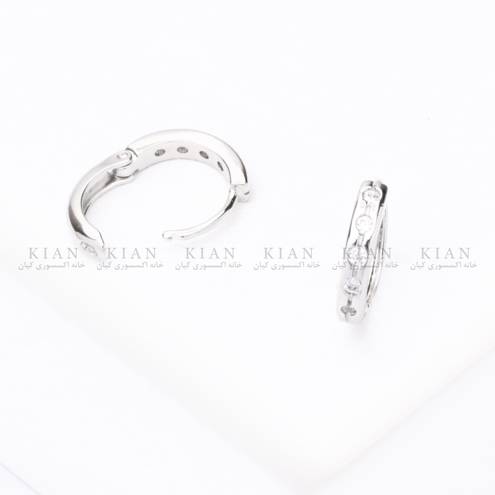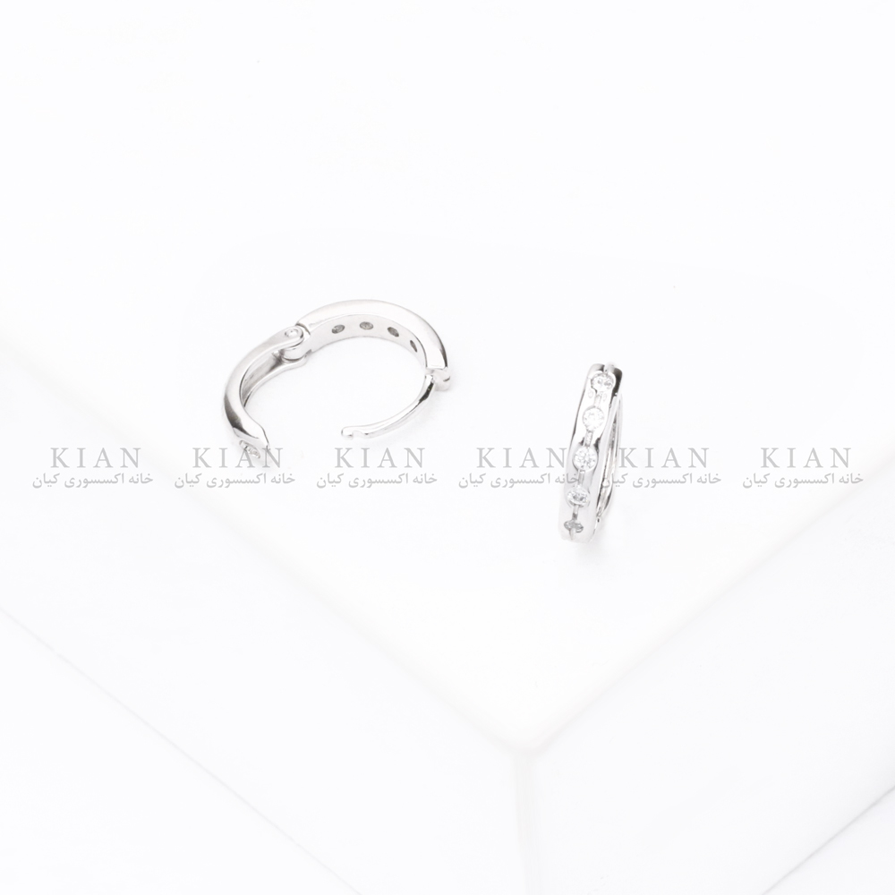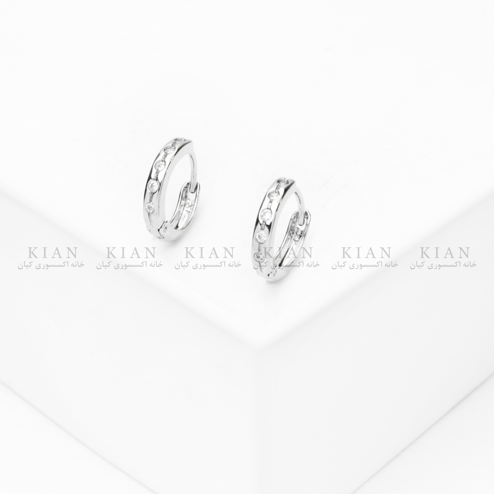 این گوشواره‌ها به شکل حلقه ریز طراحی شده‌اند و سطح بیرونی آن‌ها با ردیفی از نگین‌های سفید و کوچک پوشیده شده است. این نگین‌ها هنگام برخورد نور، برق لطیف و جذابی ایجاد می‌کنند و استایل گوشواره را از سادگی خارج کرده و به آن جلوه‌ای برازنده و دخترانه می‌بخشند.