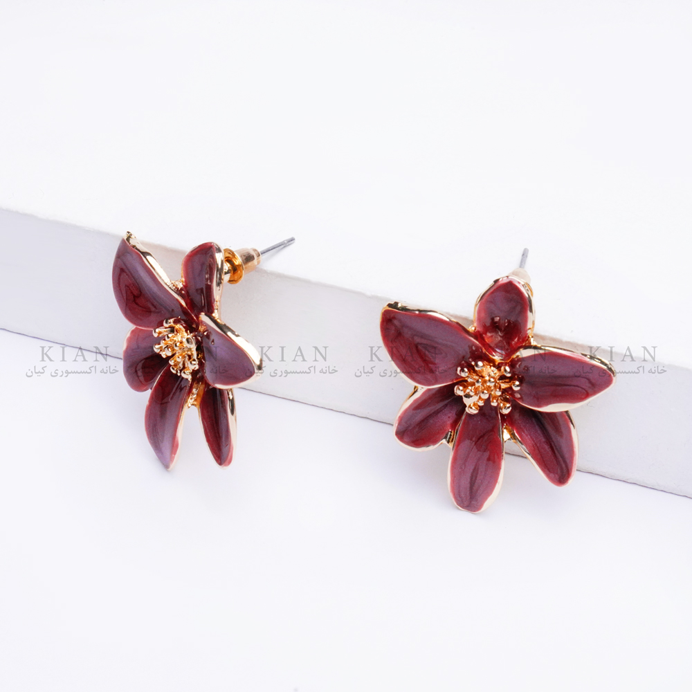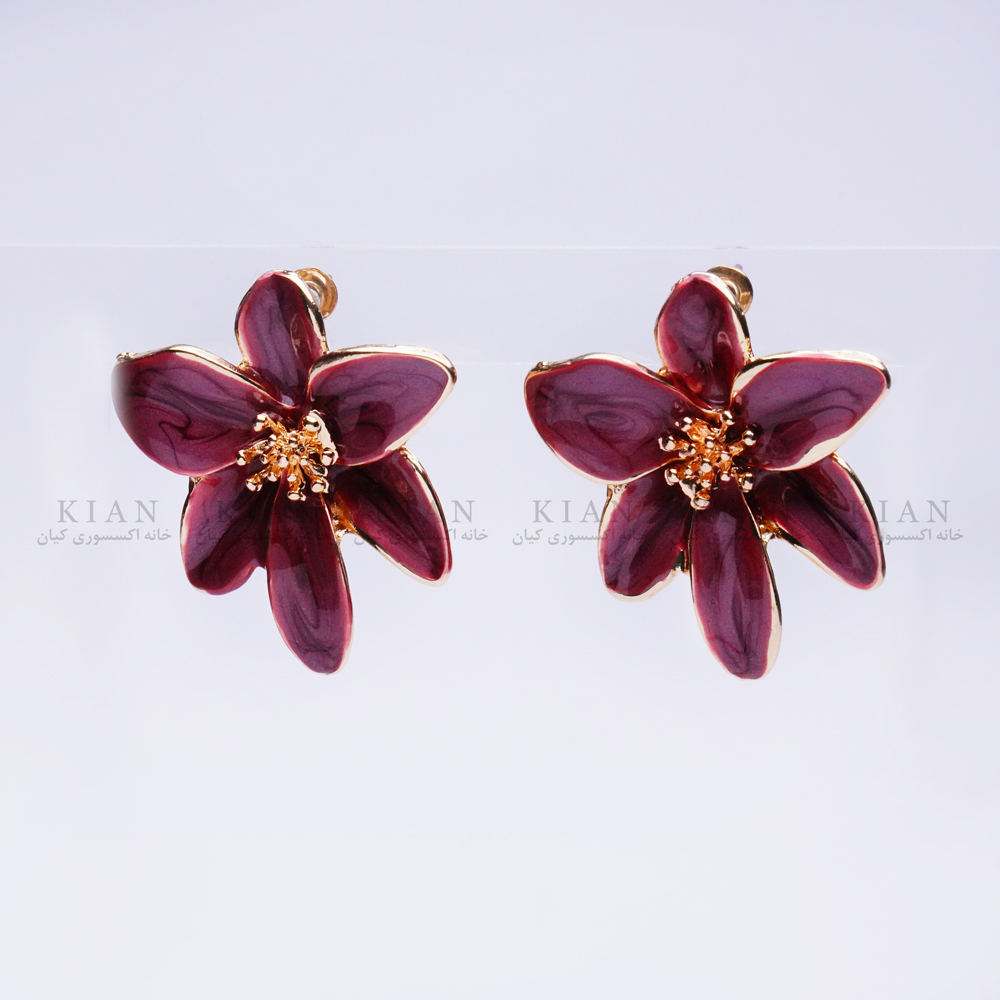 گوشواره گل بنفش از مجموعه ی خاص خانه اکسسوری کیان، ترکیبی شیک از رنگ بنفش براق و طلایی در طراحی ای منحصر به فرد و چشم گیر است.