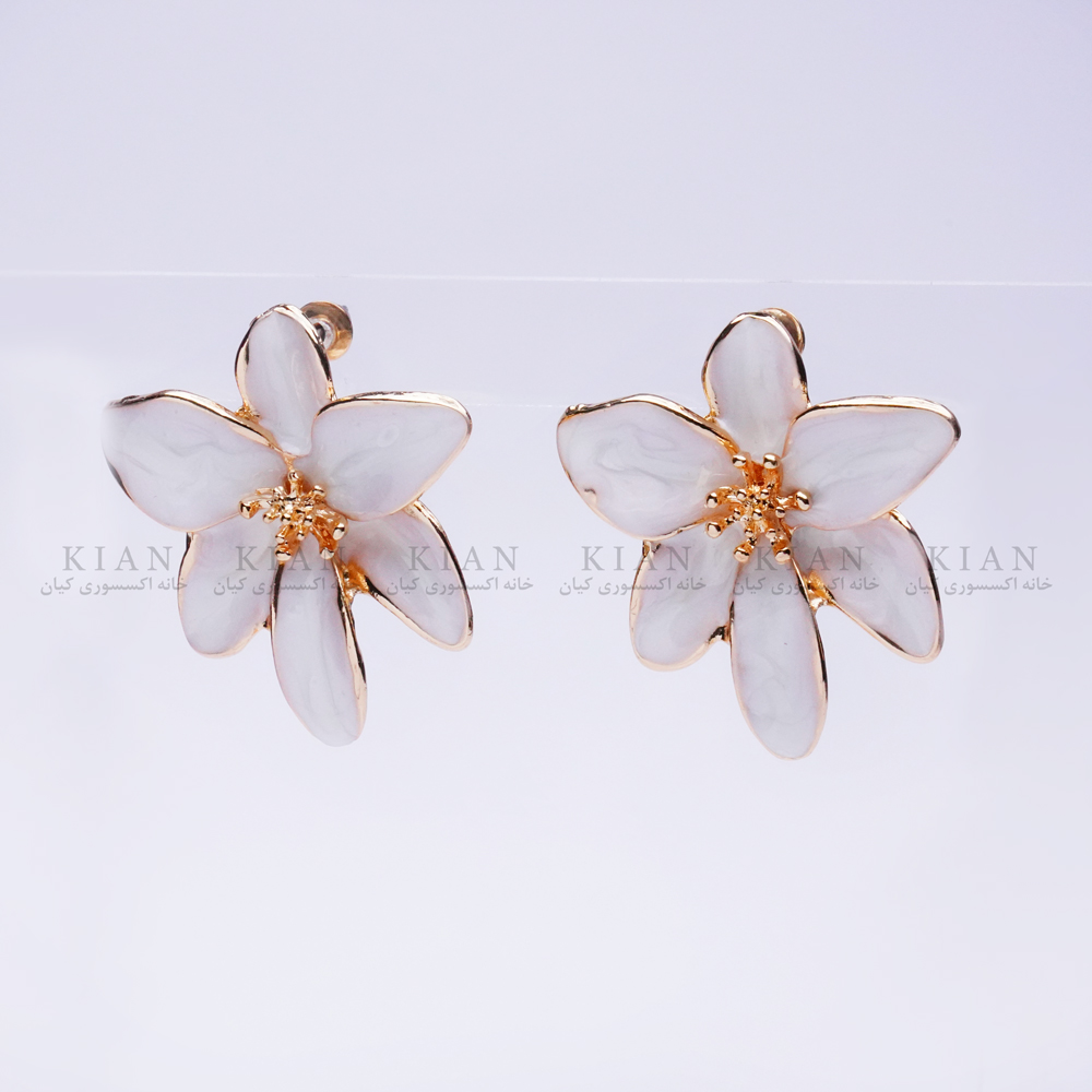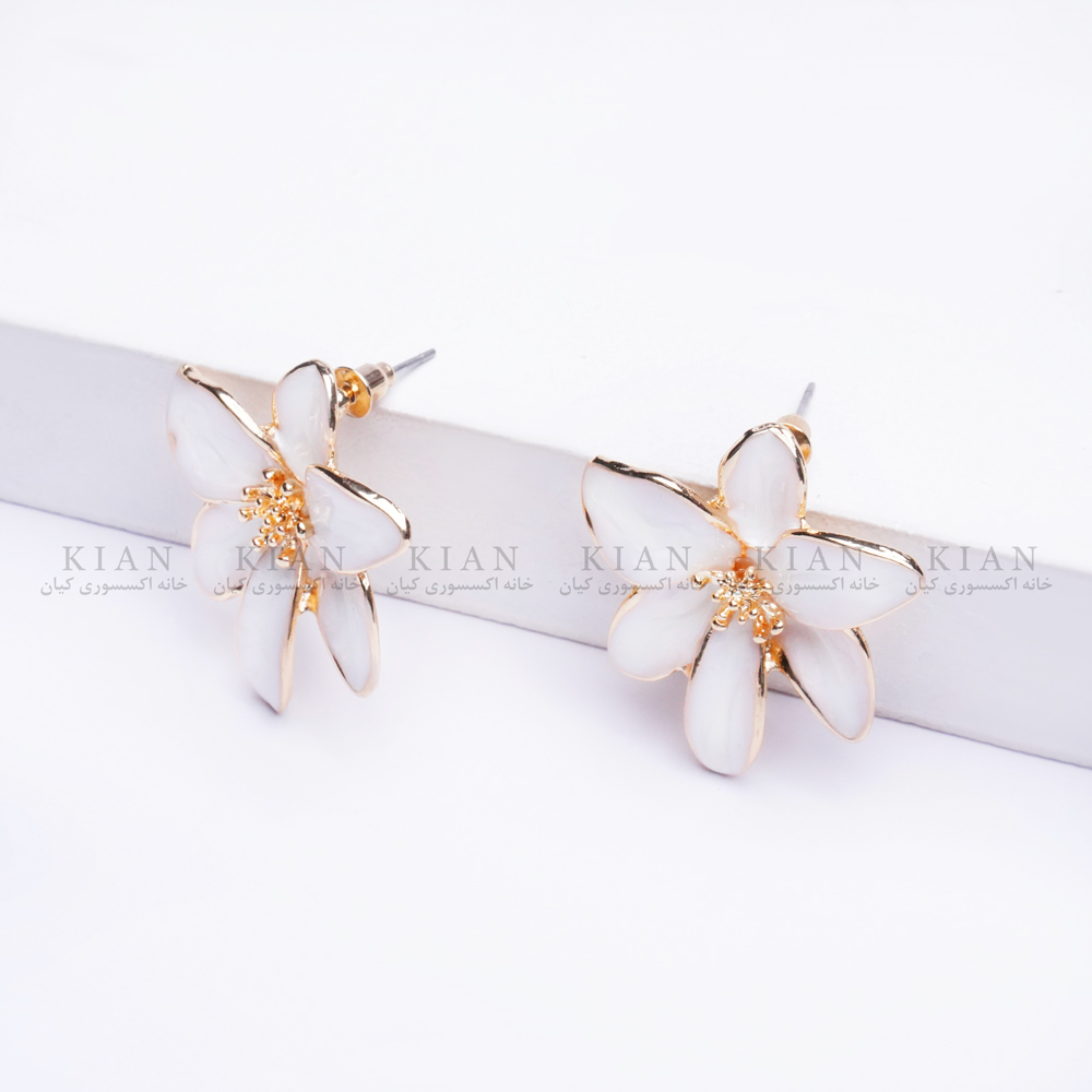 گوشواره گل سفید صدفی از مجموعه ی خاص خانه اکسسوری کیان، ترکیبی شیک از رنگ سفید صدفی براق و طلایی در طراحی ای منحصر به فرد و چشم گیر است.