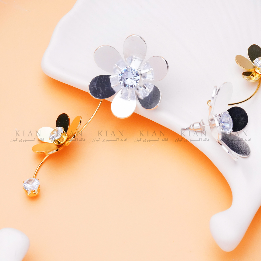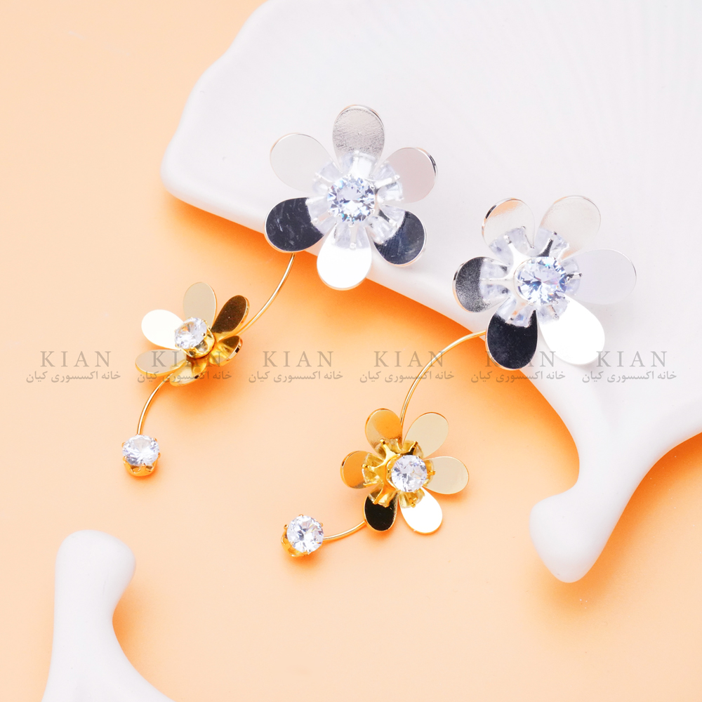 گوشواره گل نقره ای و نگین با طراحی گل شکل و نگین های براق، انتخابی ظریف و زنانه برای استایل های روزمره و رسمی است. ترکیب رنگ نقره ای درخشان با نگین های ظریف، جلوه ای شیک و جذاب به چهره می بخشد. این مدل زیبا و پرطرفدار را می توانید از خانه اکسسوری کیان با کیفیت عالی و قیمت مناسب تهیه کنید.