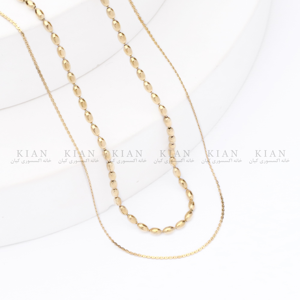 زنجیر دو رج طلایی اشکی با رنگ طلایی براق و طراحی ظریف دولایه، جلوه‌ای شیک و زنانه به استایل شما می‌بخشد. آویز اشکی ساده و مینیمال در کنار فرم دو رج، زیبایی این زنجیر را دوچندان کرده و آن را به انتخابی مناسب برای استفاده روزمره و استایل‌های نیمه‌رسمی تبدیل می‌کند. این زنجیر خوش‌فرم و سبک، با دقت توسط خانه اکسسوری کیان انتخاب شده است.