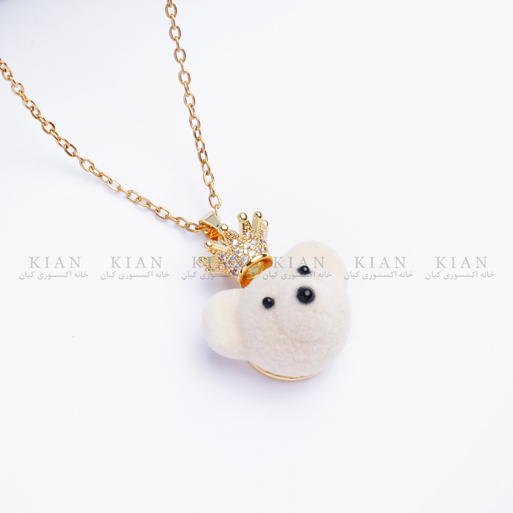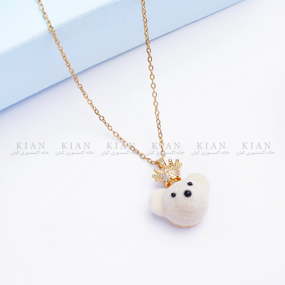 زنجیر طلایی ظریف در کنار آویز سفید تدی، تضادی زیبا و چشمگیر ایجاد کرده که در عین سادگی، جلوهای لطیف و دخترانه به گردن میدهد.