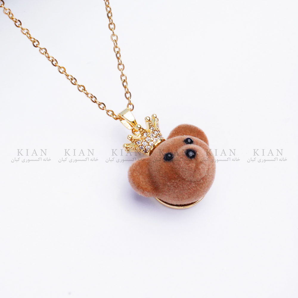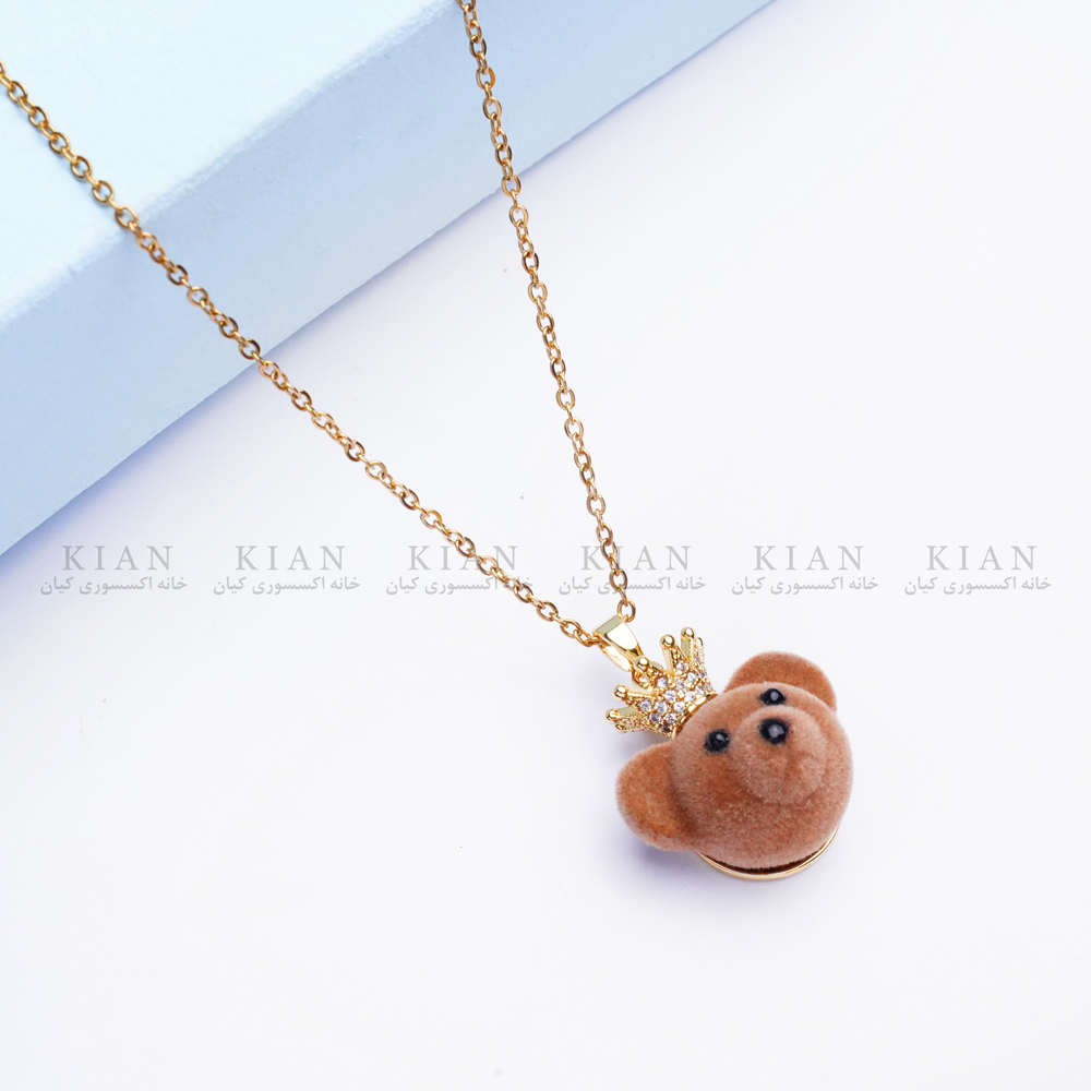 زنجیر طلایی ظریف در کنار آویز قهوه ای تدی، تضادی زیبا و چشم‌گیر ایجاد کرده که در عین سادگی، جلوه‌ای لطیف و دخترانه به گردن می‌دهد.