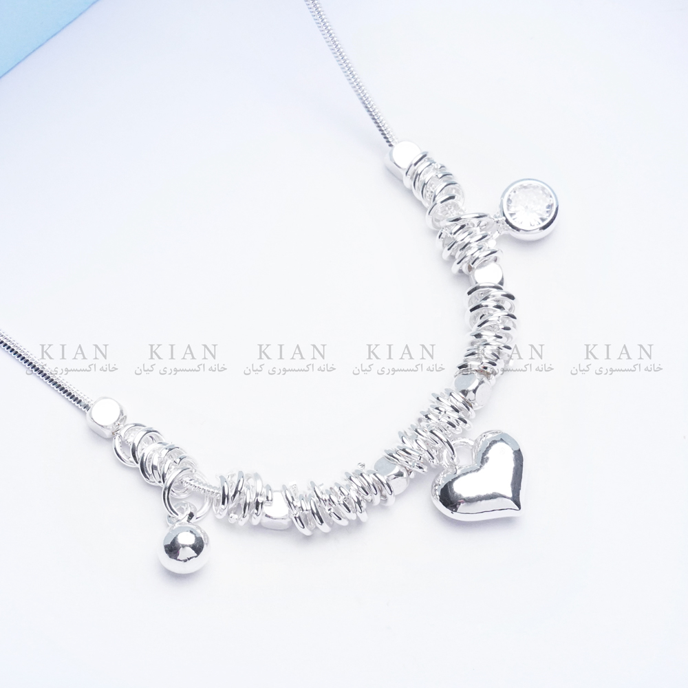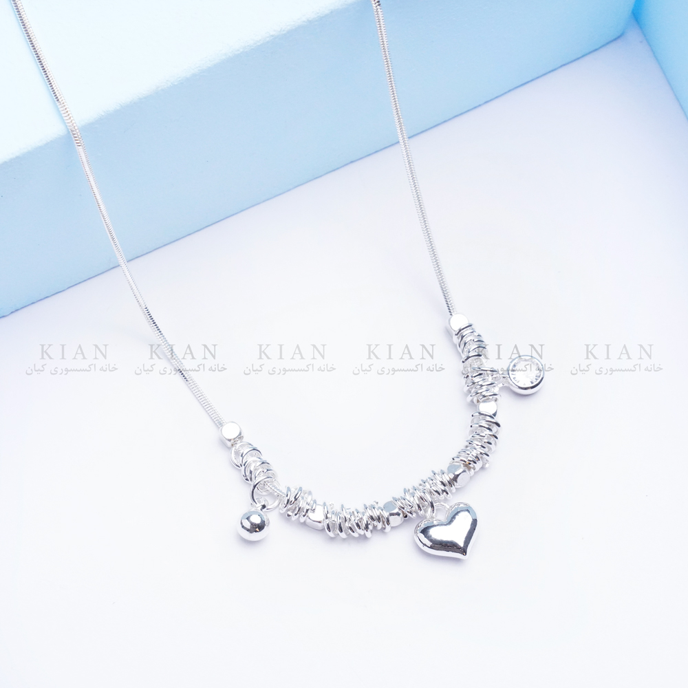 ترکیب مهره های نقره ای در کنار آویز قلب، جلوه ای عاشقانه و در عین حال شیک به این گردنبند می بخشد. رنگ نقره ای آن، به خوبی با هر استایلی از روزمره تا رسمی هماهنگ می شود و جلوه ای درخشان به ظاهر شما می دهد. طول این گردنبند 48 سانت میباشد.