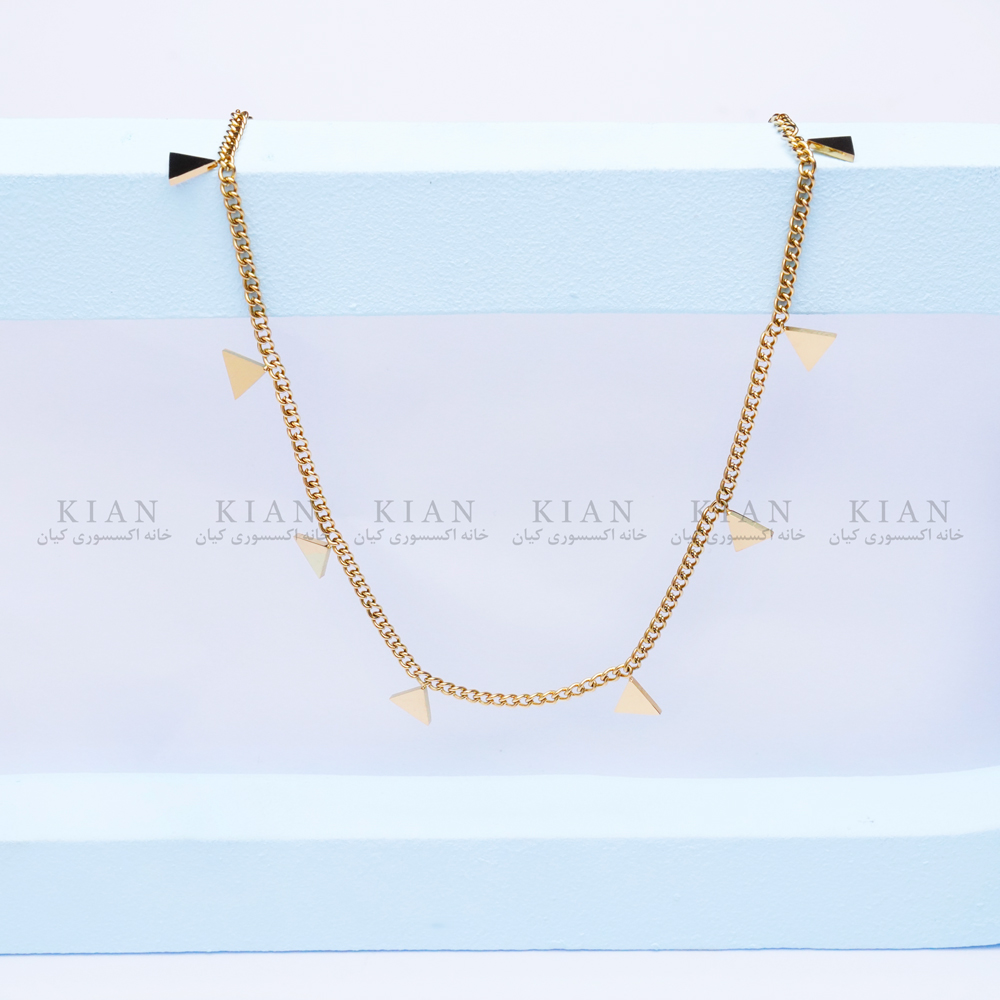 گردنبند زنجیر مثلثی طلایی از مجموعه بدلیجات خاص خانه اکسسوری کیان است. طراحی هندسی و مدرن مثلثی در کنار رنگ طلایی براق، این گردنبند را به گزینه ای ایده آل برای استایل های ترندی و امروزی تبدیل کرده است. اگر به دنبال یک اکسسوری متفاوت و شیک هستید، این گردنبند انتخابی عالی برای شما خواهد بود.