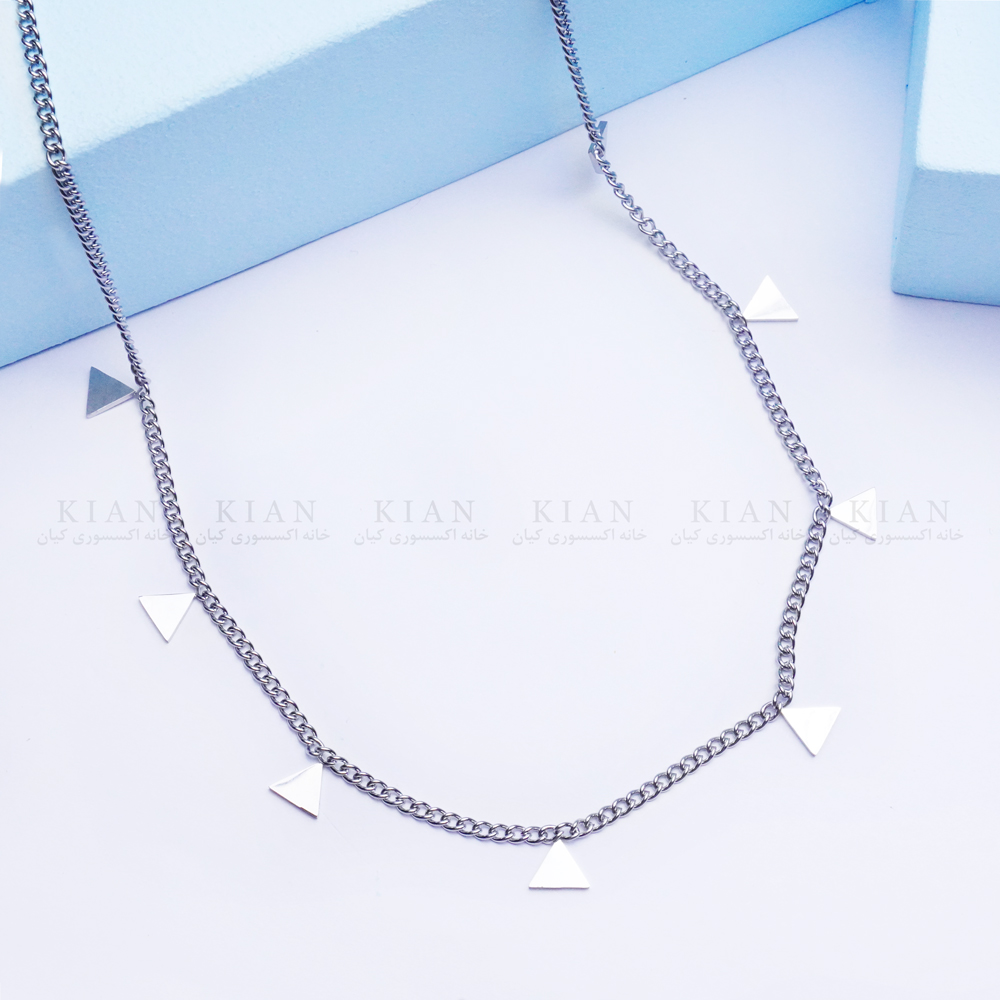 گردنبند زنجیر مثلثی نقره ای از مجموعه بدلیجات خاص خانه اکسسوری کیان است. طراحی هندسی و مدرن مثلثی در کنار رنگ نقره ای براق، این گردنبند را به گزینه ای ایده آل برای استایل های ترندی و امروزی تبدیل کرده است. اگر به دنبال یک اکسسوری متفاوت و شیک هستید، این گردنبند انتخابی عالی برای شما خواهد بود.