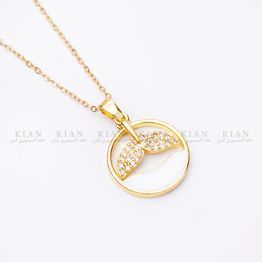 پلاک این گردنبند به شکل نیم‌دایره طراحی شده و قسمت پایینی آن با طرح موج سفید صدفی پوشیده شده است. این سطح صدفی در برخورد با نور، برق ملایمی ایجاد می‌کند و حس لطافت و آرامش دریا را منتقل می‌کند. قاب طلایی که دورتادور پلاک قرار دارد، ظاهر مدل را مرتب‌تر و لوکس‌تر کرده و تضاد رنگی زیبایی با بخش سفید ایجاد می‌کند.