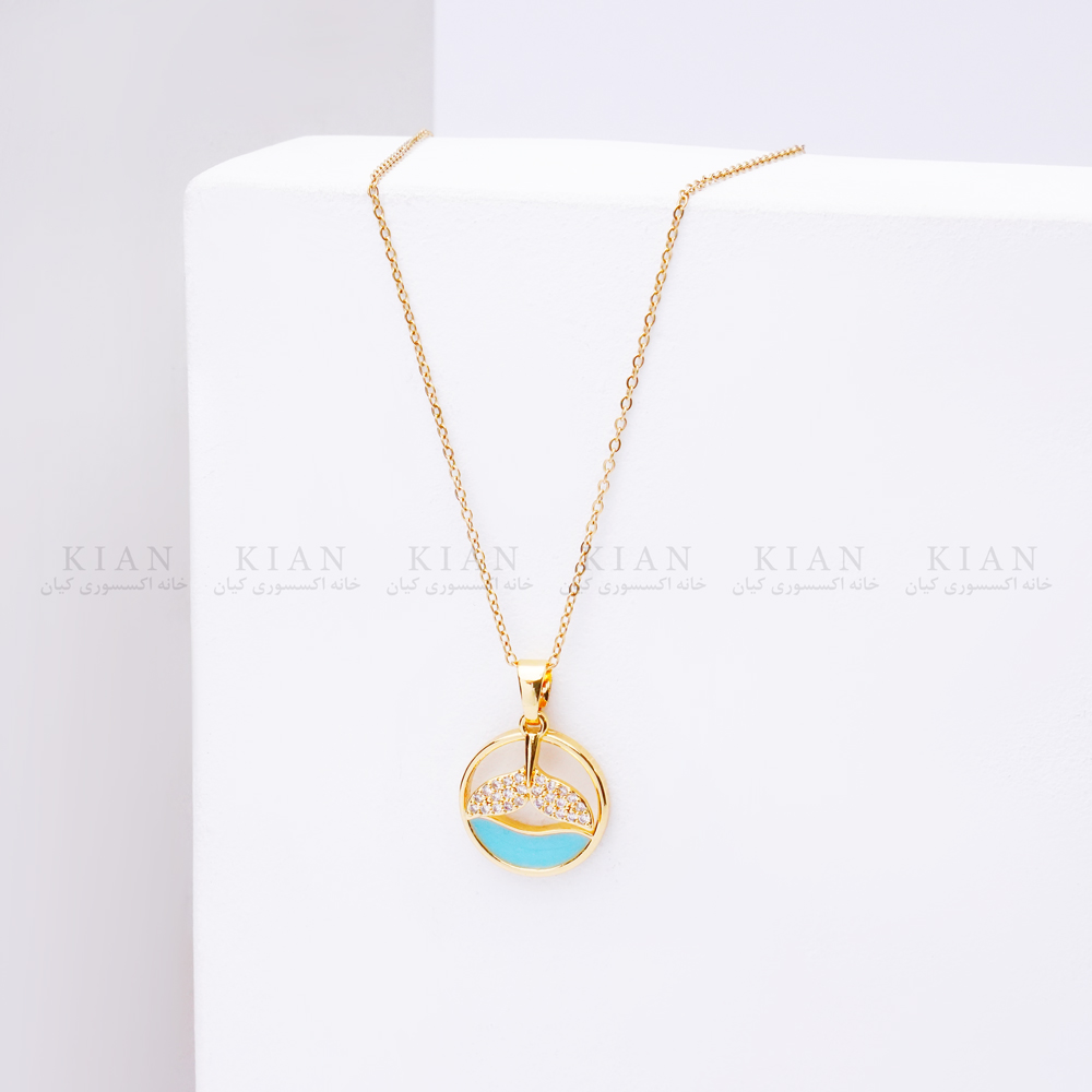پلاک این گردنبند به شکل دایره طراحی شده و نیمه پایینی آن با طرح موج آبی تزئین شده است. این بخش آبی‌ رنگ با جلوه‌ای صدفی و براق، در برخورد با نور به زیبایی می‌درخشد و حسی شبیه نور دریا در آفتاب را تداعی می‌کند. بخش بالایی پلاک با روکش طلایی براق کامل شده که تضاد زیبایی با رنگ آبی ایجاد کرده است.