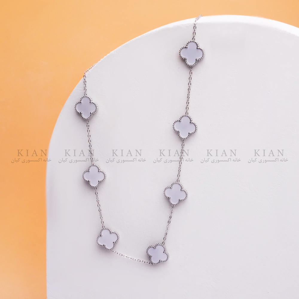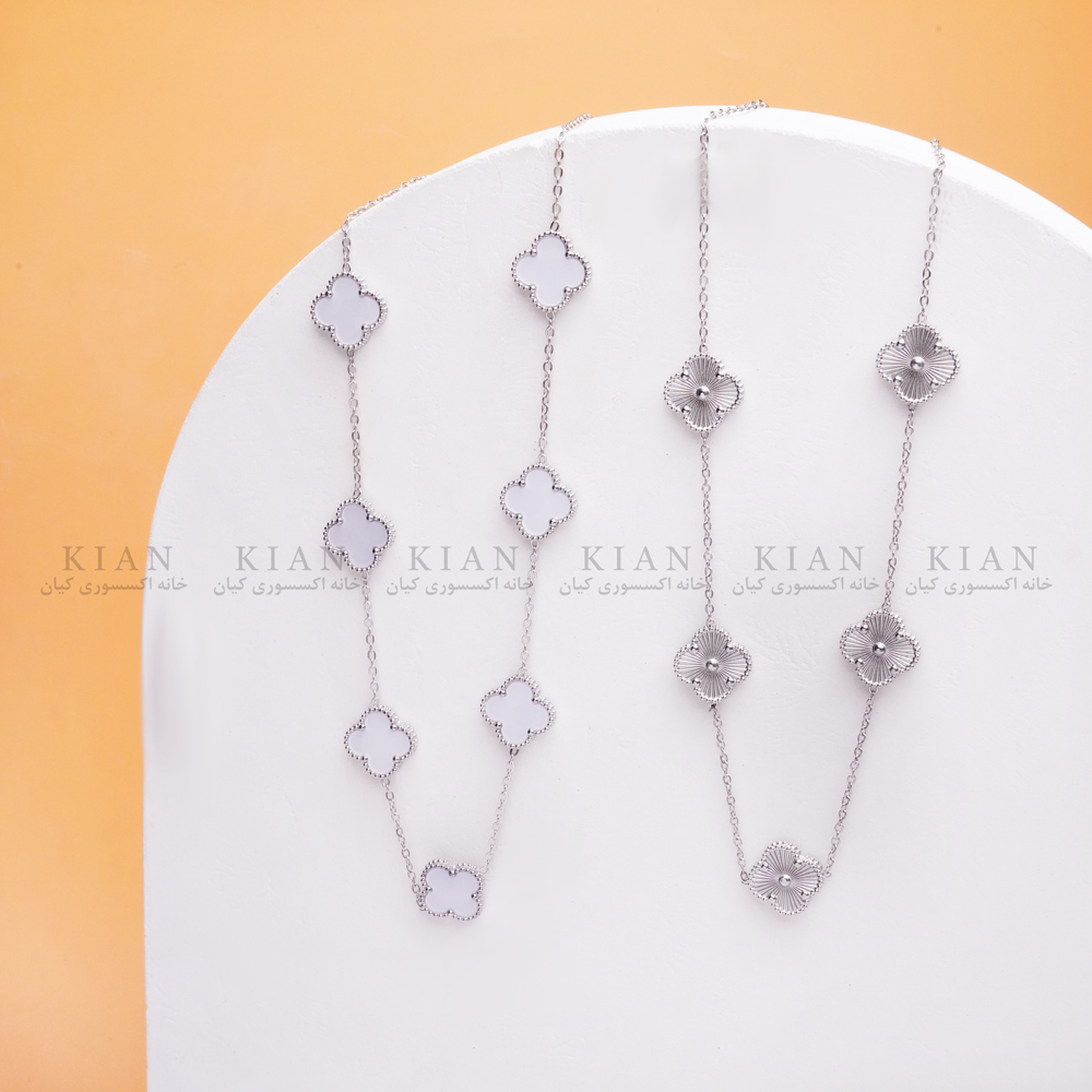 گردنبند ونکلیف نقره ای 6 با آویزهای طرح گل چهارپر، مناسب برای استایل های ظریف و شیک.