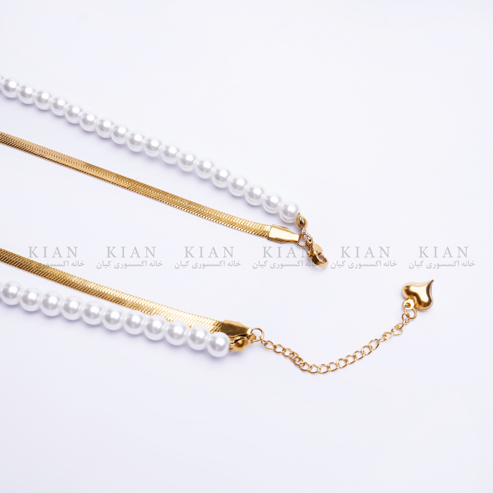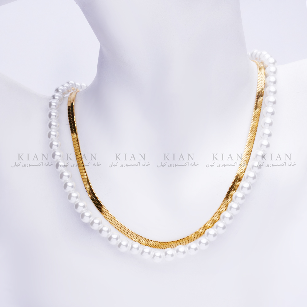 گردنبند مروارید و زنجیر ماری طلایی با ترکیب ظریف مرواریدهای براق و زنجیر ماری طلایی، جلوه ای لوکس و مدرن به استایل شما می بخشد. طراحی دو لایه و هماهنگی رنگ طلایی با درخشش سفید مروارید، آن را به انتخابی بی نقص برای مجالس رسمی، مهمانی ها و حتی استایل روزمره تبدیل کرده است.