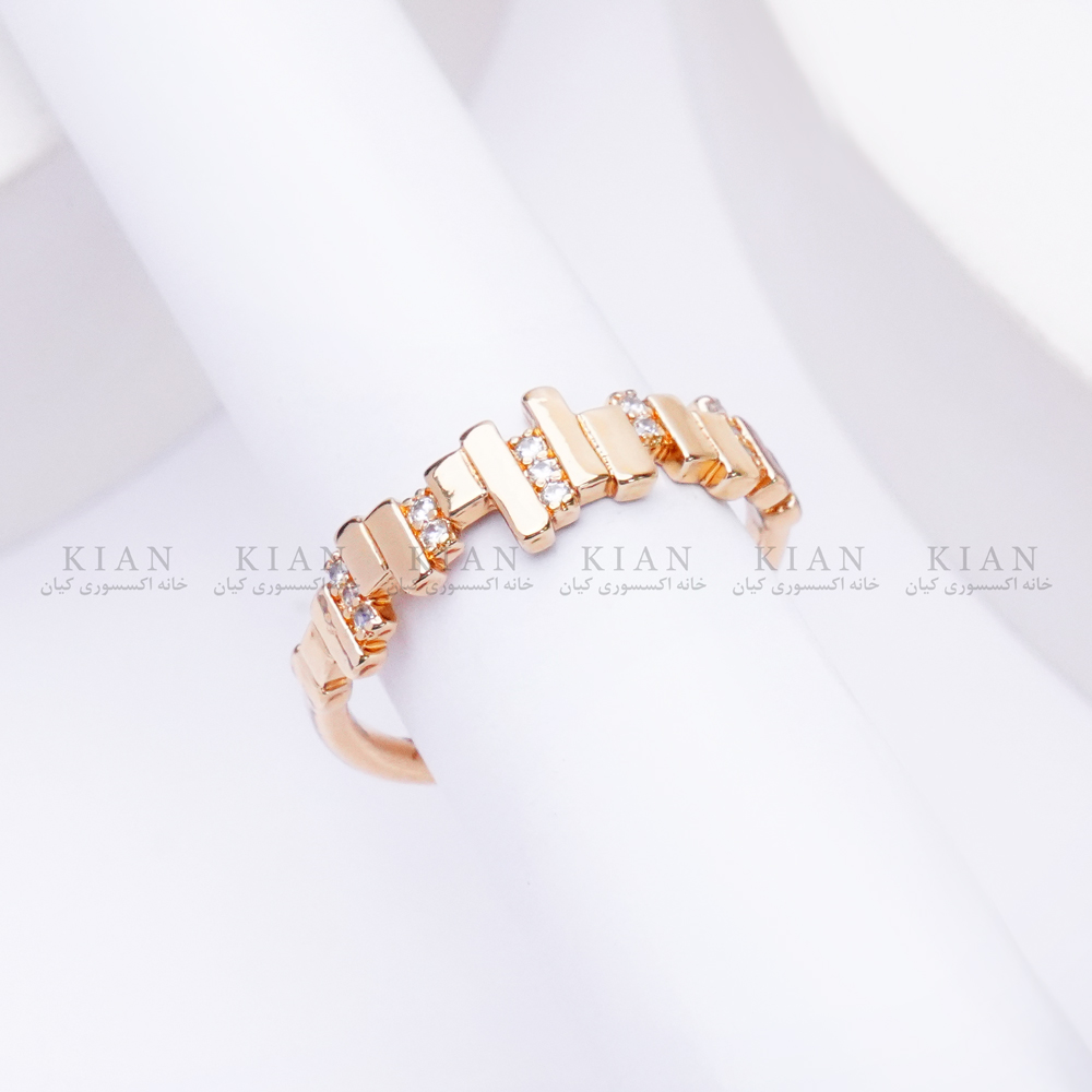 این انگشتر با بدنهی طلایی ژوپینگ طراحی شده و در بخش جلویی، ترکیبی از خطوط عمودی فلزی و نگینهای ریز درخشان دیده میشود. این چیدمان خطی + نگینی، جلوهای سهبعدی و بسیار شیک به مدل میدهد و باعث میشود انگشتر از هر زاویه براق و حرفهای دیده شود. طراحی باز انگشتر نیز امکان تنظیم سایز و قرارگیری راحت روی انگشت را فراهم میکند.