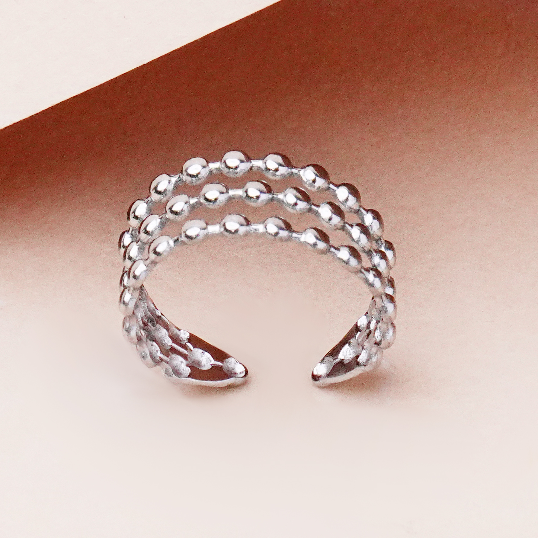 یه انگشتر با طراحی ظریف و در عین حال پرجزئیات که از سه رینگ باریک و ساچمهای ساخته شده. این ترکیب باعث میشه روی دست جلوهای لایهلایه و پویا داشته باشه، بدون اینکه شلوغ یا سنگین به نظر برسه. طراحی ریز و مینیمالش، انگشتر رو برای استفادهی روزمره مناسب میکنه و همزمان حس مدرن و متفاوتی به استایل اضافه میکنه. از خانه اکسسوری کیان، انتخابی ایدهآل برای کسانی که دنبال اکسسوریهای ظریف، شیک و چشمگیر هستن.