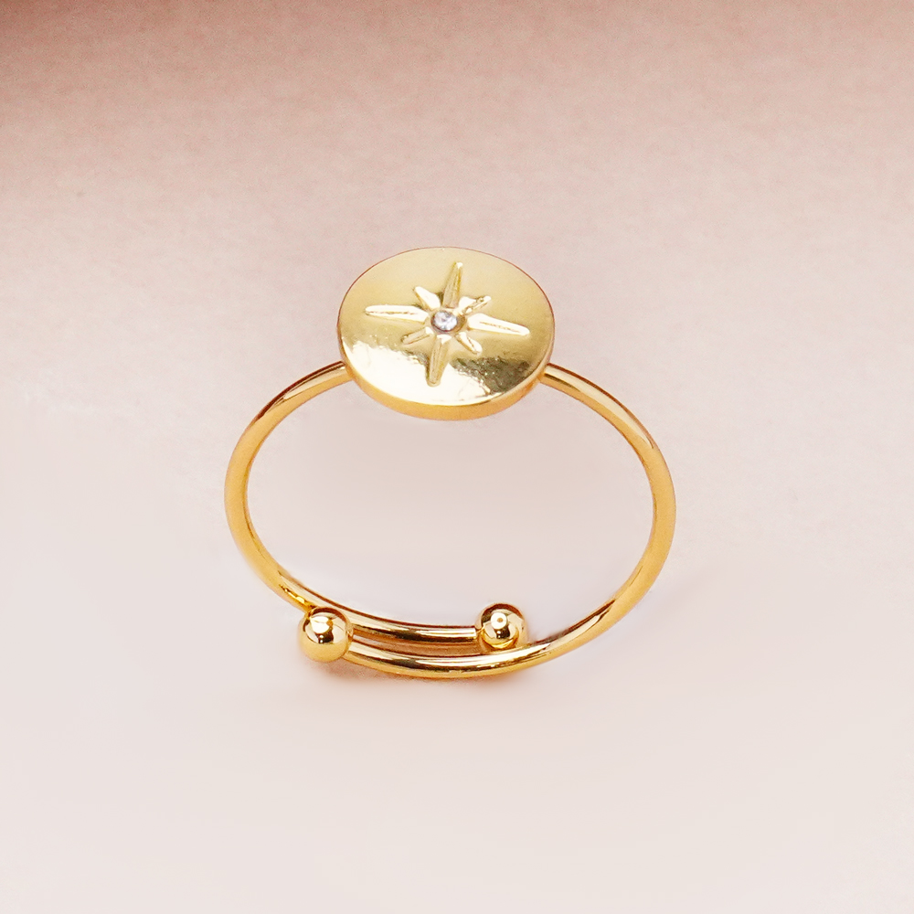 انگشتر طلایی دایره خورشیدی با طراحی مدرن و الهامگرفته از شکل خورشید، جلوهای شیک و درخشان به استایل شما میبخشد. فرم دایرهای و پرتوهای ظریف آن، نور را به زیبایی منعکس کرده و انگشتر را از طرحهای ساده متمایز میکند.