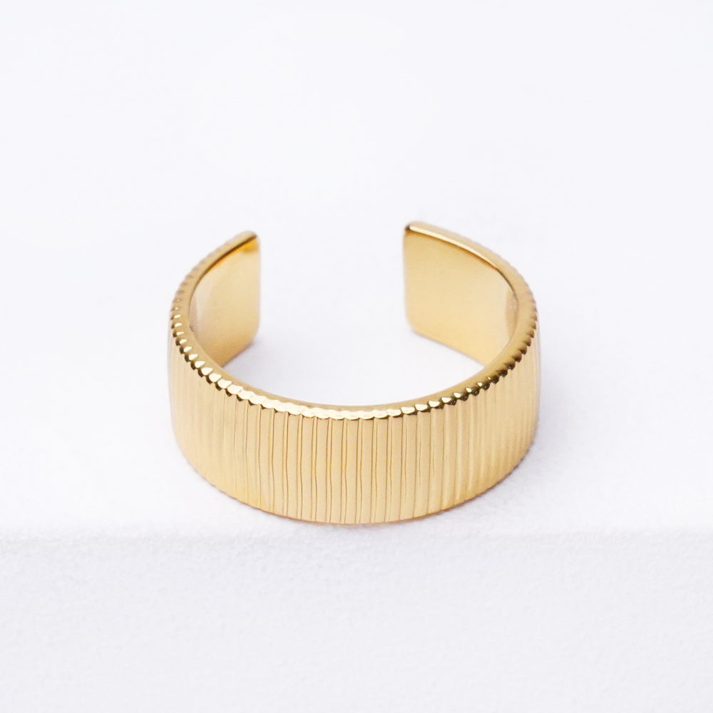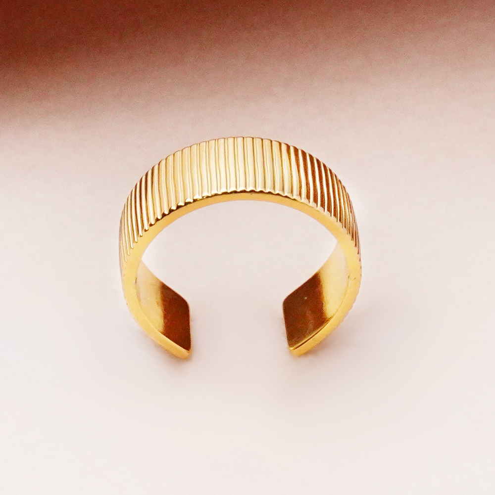 انگشتر طلایی رینگی پهن شیاردار با طراحی مدرن و بدنه پهن، جلوهای متفاوت و چشمگیر به استایل شما میبخشد. شیارهای ظریف روی سطح انگشتر باعث ایجاد بافت و جزئیات جذاب شده و آن را از طرحهای ساده متمایز میکند.