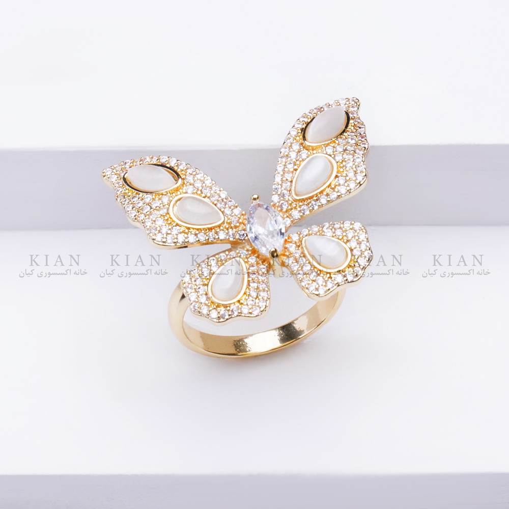 انگشتر پروانه طلایی نگین اشکی با بدنه ای از فلز مقاوم و رنگ طلایی براق طراحی شده است. نگین اشکی شفاف در مرکز پروانه، زیبایی و جلوه ای خاص به این انگشتر می بخشد و استایل شما را لوکس تر و جذاب تر می کند. این محصول از مجموعه بدلیجات خاص خانه اکسسوری کیان است و می تواند انتخابی عالی برای استفاده روزمره، مهمانی ها یا هدیه ای متفاوت برای عزیزانتان باشد.