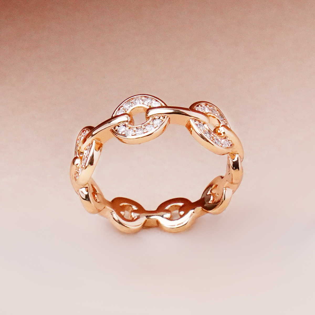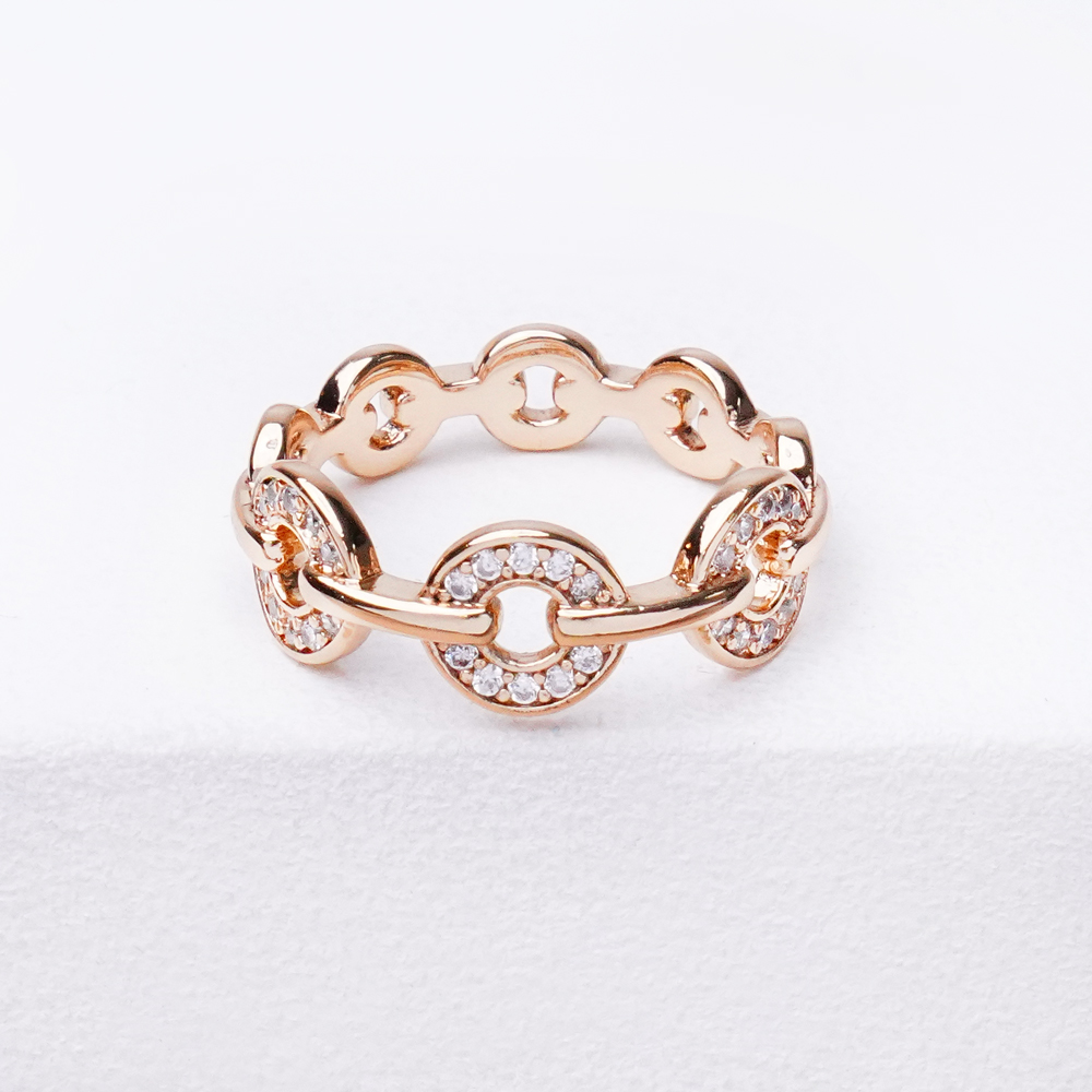 انگشتر ژوپینگ دایره نگیندار با طراحی ظریف و فرم دایرهای، جلوهای شیک و چشمنواز به استایل شما میبخشد. نگینهای ریز و درخشان کارشده روی این انگشتر، نور را به زیبایی منعکس کرده و ظاهر آن را لطیف و جذاب نشان میدهد.