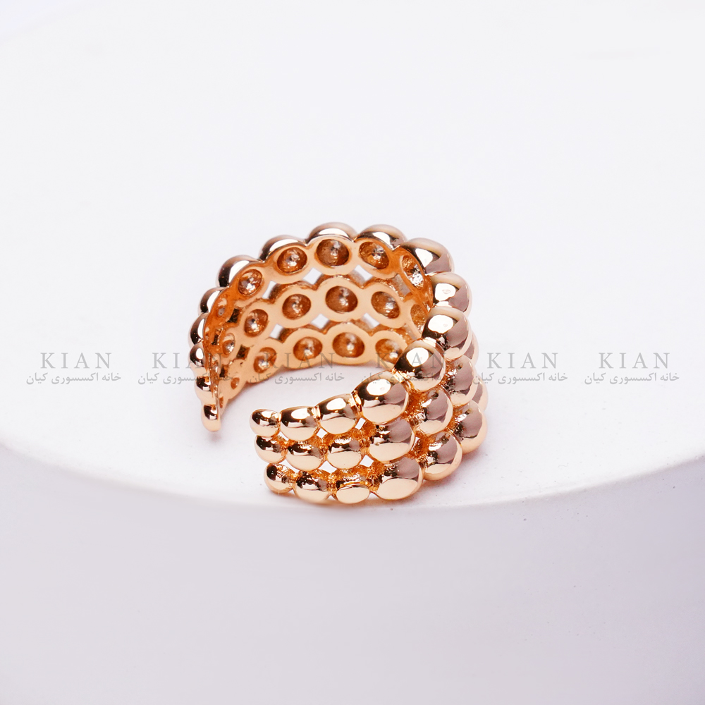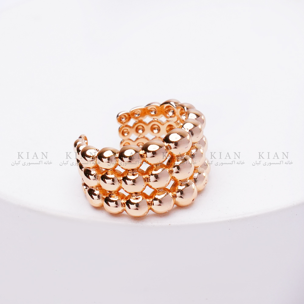 این انگشتر از ردیف‌های متعدد توپک‌های طلایی براق ساخته شده که کنار هم قرار گرفته‌اند و حالت چندلایه و جذابی تشکیل داده‌اند. همین طراحی ساچمه‌ای باعث می‌شود انگشتر در نور بدرخشد و روی دست کاملاً خاص و حرفه‌ای دیده شود. رنگ طلایی گرم و آبکاری ژوپینگ درجه‌یک، کیفیت بالا و ماندگاری این مدل را تضمین می‌کند.
