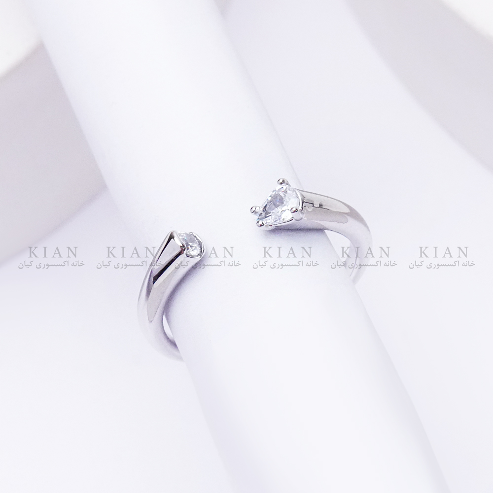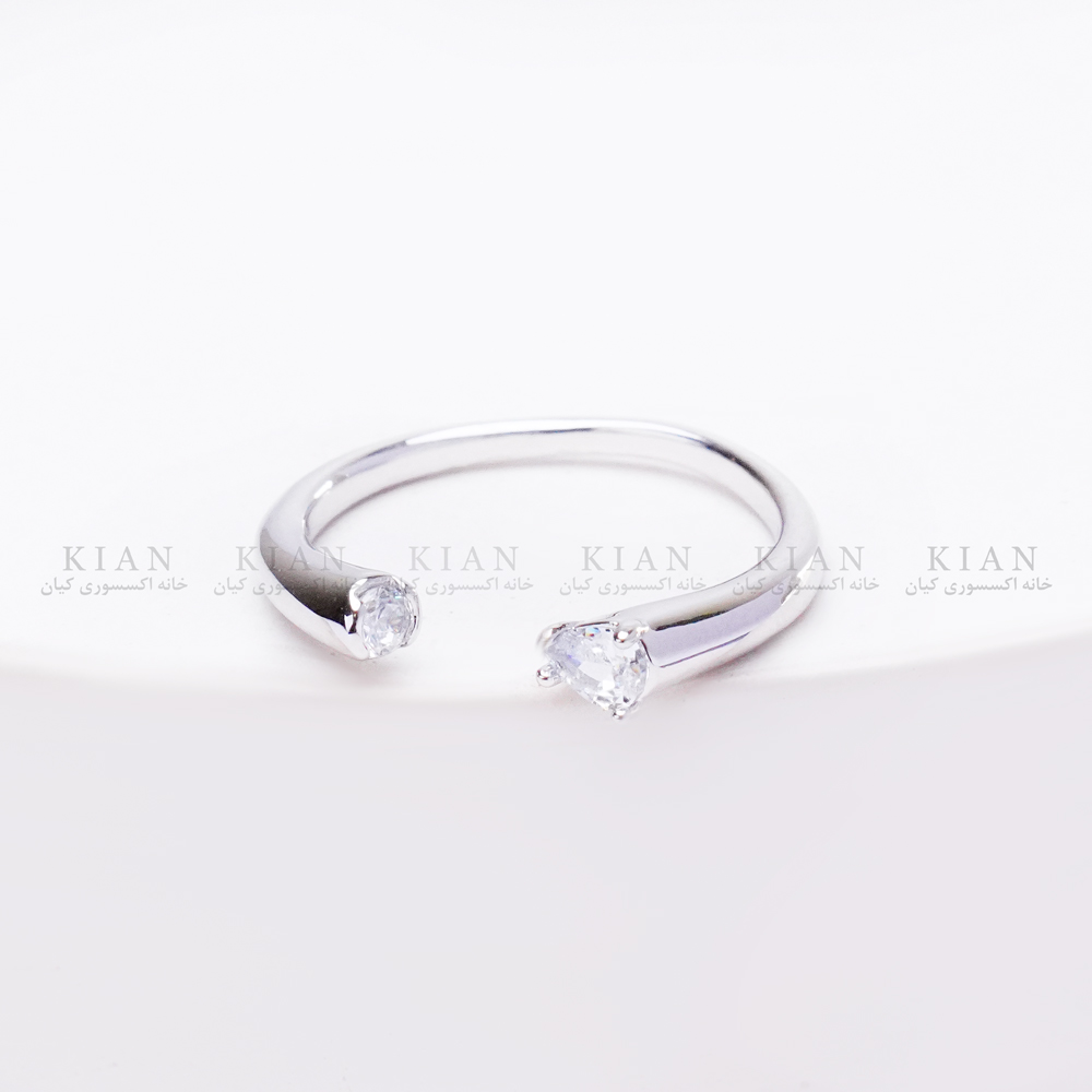 این انگشتر با آبکاری ژوپینگ نقرهای ساخته شده و طراحی آن بهصورت دو سر باز است. در دو انتهای انگشتر، دو نگین کریستالی درخشان قرار گرفته که یکی بزرگتر و دیگری کوچکتر است. همین ترکیب اندازهها، جلوهای نامتقارن اما فوقالعاده جذاب به مدل میدهد و آن را از انگشترهای معمولی متمایز میکند.