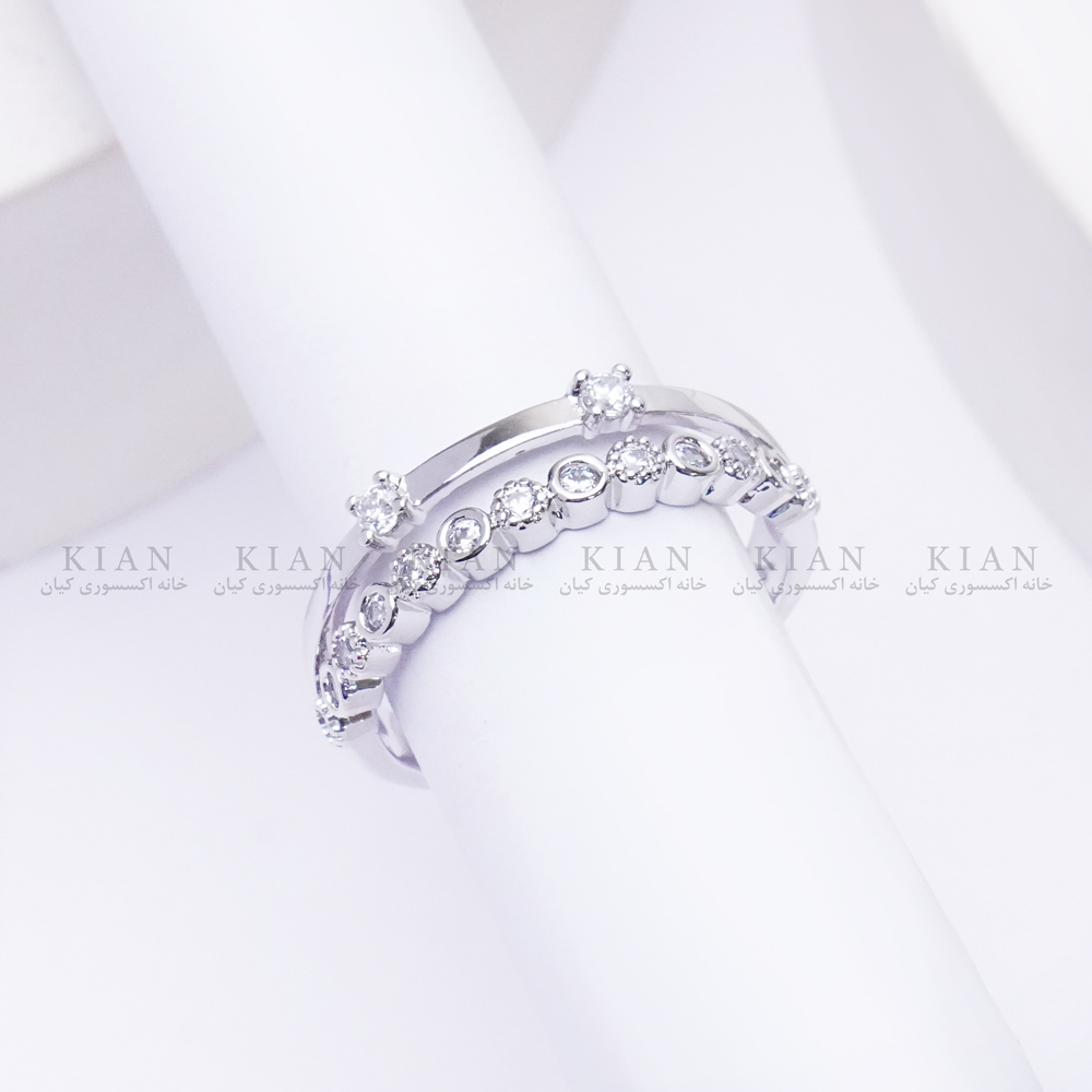 این انگشتر با آبکاری ژوپینگ نقرهای ساخته شده و در بخش جلویی دارای چند ردیف نگین کریستالی ریز است که بهصورت یکدست و منظم کنار هم قرار گرفتهاند. این نگینها با درخشش بالای خود، مدل را از هر زاویه زیبا، براق و کاملاً مجلسی نشان میدهند. ترکیب ظرافت طرح با براقیت رنگ نقرهای، این مدل را بسیار شیک و پرفروش کرده است.