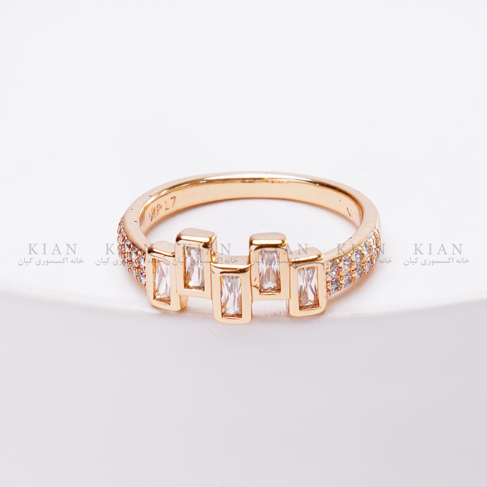 این انگشتر با بدنه‌ی طلایی ژوپینگ و طراحی باز ساخته شده و در قسمت جلویی آن سه نگین خطی مستطیلی کنار هم قرار گرفته‌اند. این چیدمان خطی باعث می‌شود انگشتر از رو‌به‌رو بسیار خوش‌فرم، کشیده و شیک دیده شود. دو طرف بدنه نیز با ردیفی از نگین‌های ریز تزئین شده تا درخشش مدل چند برابر شود.