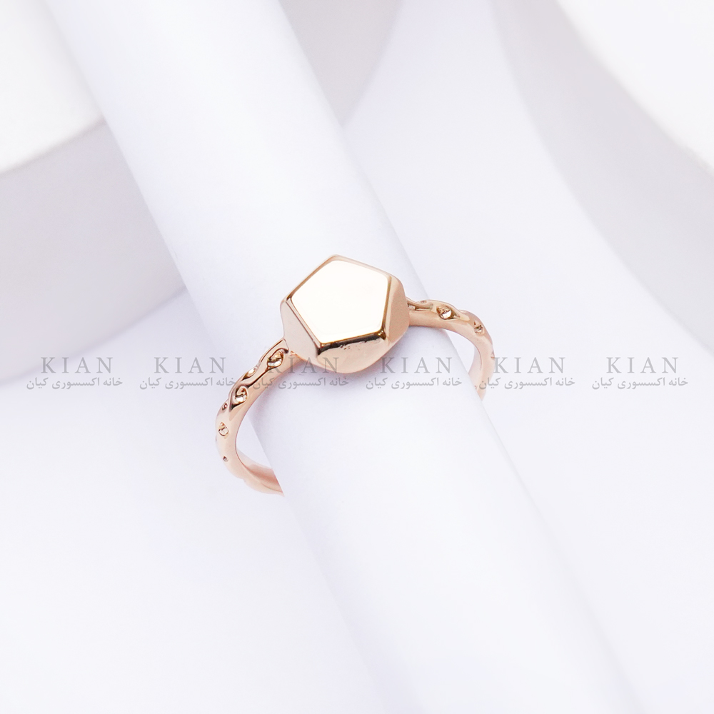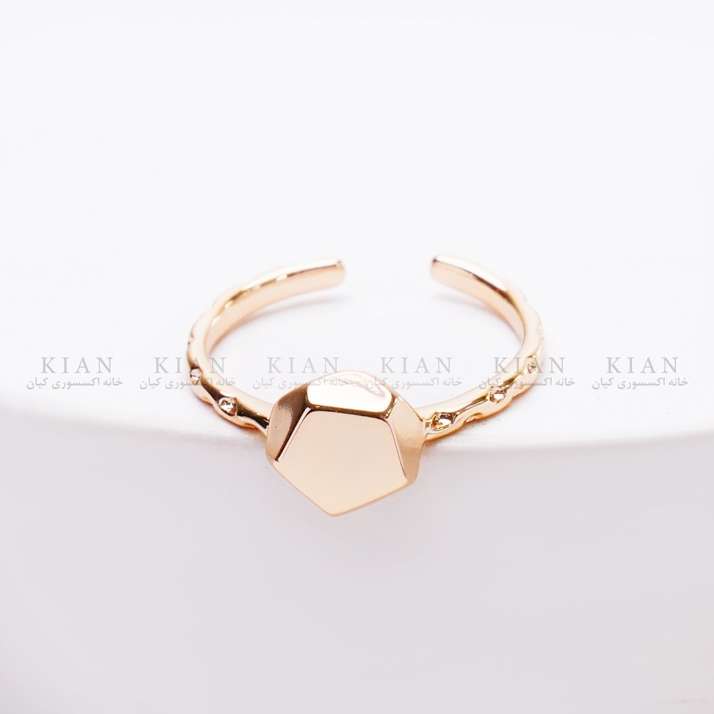 این انگشتر با بدنه‌ی طلایی ژوپینگ ساخته شده و در بخش جلویی آن یک فرم چندضلعی هندسی قرار دارد. سطح براق و آینه‌ای این فرم باعث می‌شود نور را به‌زیبایی بازتاب دهد و جلوه‌ای ساده اما بسیار شیک ایجاد کند. طراحی باز انگشتر نیز امکان تنظیم سایز را فراهم می‌کند تا روی انگشت کاملاً راحت و خوش‌فرم بنشیند.